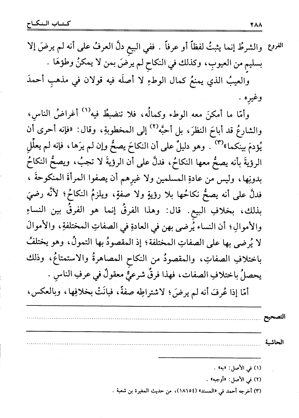 وَأَمَّا مَا أَمْكَنَ مَعَهُ الْوَطْءُ وَكَمَالُهُ فَلَا تَنْضَبِطُ فِيهِ1 أَغْرَاضُ النَّاسِ، وَالشَّارِعُ قَدْ أَبَاحَ النَّظَرَ بَلْ أَحَبَّهُ2 إلَى الْمَخْطُوبَةِ، وَقَالَ: "فَإِنَّهُ أَحْرَى أَنْ يُؤْدَمَ بَيْنَكُمَا" 3 وَهُوَ دَلِيلٌ عَلَى أَنَّ النِّكَاحَ يَصِحُّ وَإِنْ لَمْ يَرَهَا، فَإِنَّهُ لَمْ يُعَلِّلْ الرُّؤْيَةَ بِأَنَّهُ يَصِحُّ مَعَهَا النِّكَاحُ، فَدَلَّ عَلَى أَنَّ الرُّؤْيَةَ لَا تَجِبُ، وَيَصِحُّ النِّكَاحُ بِدُونِهَا. وَلَيْسَ مِنْ عَادَةِ الْمُسْلِمِينَ وَلَا غَيْرِهِمْ أَنْ يَصِفُوا الْمَرْأَةَ الْمَنْكُوحَةَ، فَدَلَّ عَلَى أَنَّهُ يَصِحُّ نِكَاحُهَا بِلَا رُؤْيَةٍ وَلَا صِفَةٍ، وَيَلْزَمُ النِّكَاحُ؛ لِأَنَّهُ رَضِيَ بِذَلِكَ، بِخِلَافِ الْبَيْعِ، قَالَ: وَهَذَا الْفَرْقُ إنَّمَا هُوَ الْفَرْقُ بَيْنَ النِّسَاءِ وَالْأَمْوَالِ أَنَّ النِّسَاءُ يَرْضَى بِهِنَّ فِي الْعَادَةِ فِي الصِّفَاتِ الْمُخْتَلِفَةِ، وَالْأَمْوَالَ لَا يَرْضَى بِهَا عَلَى الصِّفَاتِ الْمُخْتَلِفَةِ إذْ الْمَقْصُودُ بِهَا التَّمَوُّلُ، وَهُوَ يَخْتَلِفُ بِاخْتِلَافِ الصِّفَاتِ، وَالْمَقْصُودُ مِنْ النِّكَاحِ الْمُصَاهَرَةُ وَالِاسْتِمْتَاعُ، وَذَلِكَ يَحْصُلُ بِاخْتِلَافِ الصِّفَاتِ، فَهَذَا فَرْقٌ شَرْعِيٌّ مَعْقُولٌ فِي عُرْفِ النَّاسِ.