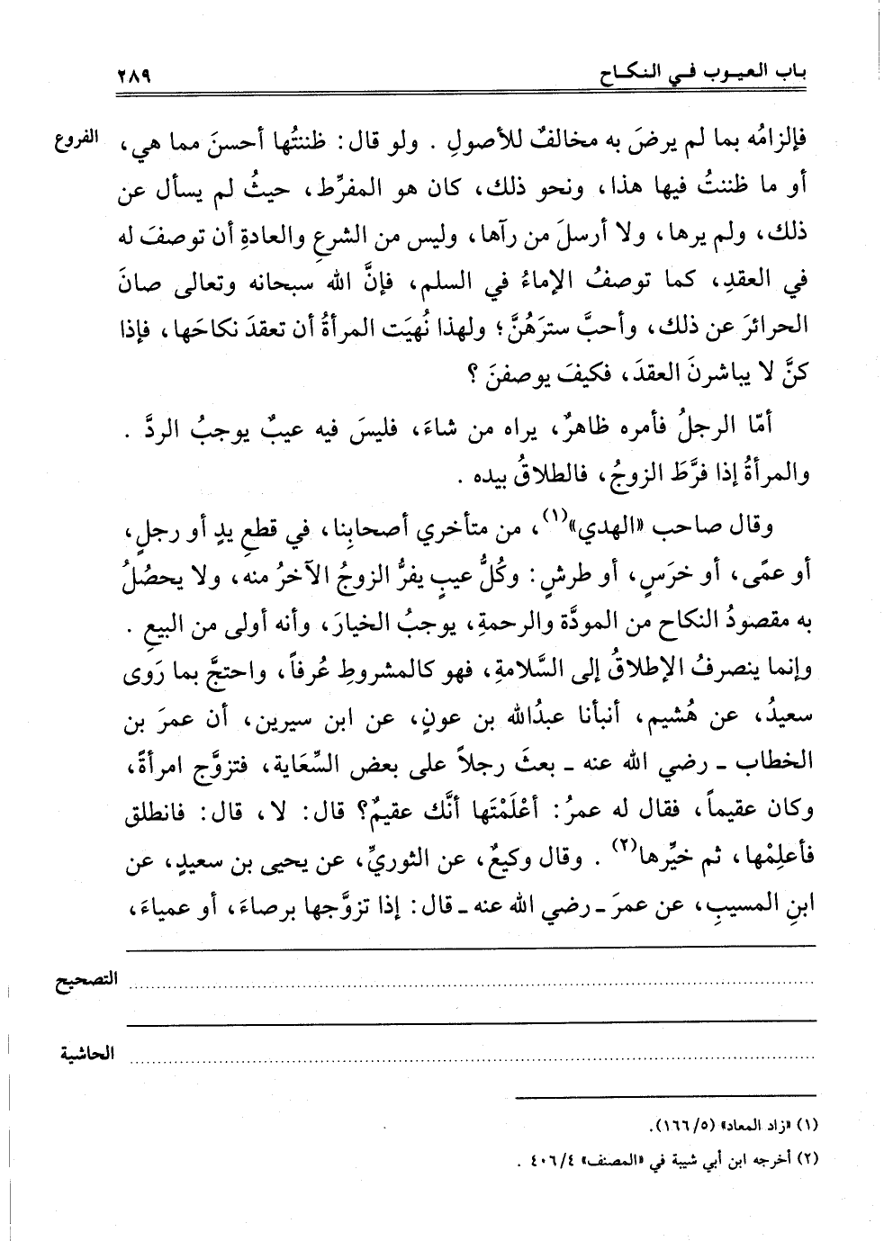 وَقَالَ صَاحِبُ الْهَدْيِ1 مِنْ مُتَأَخِّرِي أَصْحَابِنَا فِي قَطْع يَدٍ أَوْ رَجُلٍ أَوْ عَمًى أَوْ خَرَسٍ أَوْ طَرَشٍ وَكُلِّ عَيْبٍ يَفِرُّ الزَّوْجُ الْآخَرُ مِنْهُ وَلَا يَحْصُلُ بِهِ مَقْصُودُ النِّكَاحِ مِنْ الْمَوَدَّةِ وَالرَّحْمَةِ: يُوجِبُ الْخِيَارَ، وَأَنَّهُ أَوْلَى مِنْ الْبَيْعِ، وَإِنَّمَا يَنْصَرِفُ الْإِطْلَاقُ إلَى السَّلَامَةِ، فَهُوَ كَالْمَشْرُوطِ عُرْفًا، وَاحْتَجَّ بِمَا رَوَى سَعِيدٌ عَنْ هُشَيْمٍ أَنْبَأَنَا عَبْدُ اللَّهِ بْنُ عَوْنٍ عَنْ ابْنِ سِيرِينَ أَنَّ عُمَرَ بْنَ الْخَطَّابِ رَضِيَ اللَّهُ عَنْهُ بَعَثَ رَجُلًا عَلَى بَعْضِ السِّعَايَةِ، فَتَزَوَّجَ امْرَأَةً وَكَانَ عَقِيمًا، فَقَالَ لَهُ عُمَرُ: أَعْلَمْتهَا أَنَّك عَقِيمٌ؟ قَالَ: لَا. قَالَ: فَانْطَلِقْ فَأَعْلِمْهَا ثُمَّ خَيِّرْهَا2. وَقَالَ وَكِيعٌ عَنْ الثَّوْرِيِّ عَنْ يَحْيَى بْنِ سَعِيدٍ عَنْ ابْنِ الْمُسَيِّبِ عَنْ عُمَرَ رَضِيَ اللَّهُ عَنْهُ قَالَ: إذَا تَزَوَّجَهَا برصاء أو عمياء