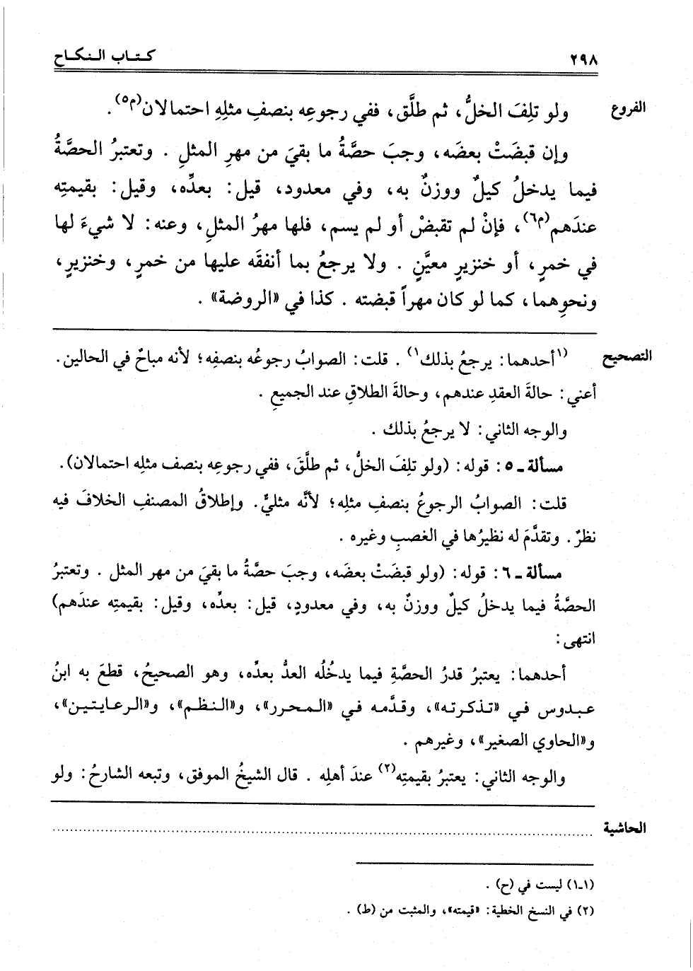 وَإِنْ قَبَضَتْ بَعْضَهُ وَجَبَ حِصَّةُ "م 6" مَا بَقِيَ مِنْ مَهْرِ الْمِثْلِ. وَتُعْتَبَرُ الْحِصَّةُ فِيمَا يَدْخُلُ كَيْلٌ وَوَزْنٌ بِهِ، وَفِي مَعْدُودٍ قِيلَ بِعَدِّهِ، وَقِيلَ بِقِيمَتِهِ عِنْدَهُمْ، فَإِنْ لَمْ تَقْبِضْ أَوْ لَمْ يُسَمِّ فَلَهَا مَهْرُ المثل، وعنه: لا شيء لَهَا فِي خَمْرٍ أَوْ خِنْزِيرٍ مُعَيَّنٍ، وَلَا يَرْجِعُ بِمَا أَنْفَقَهُ عَلَيْهَا مِنْ خَمْرٍ وَخِنْزِيرٍ وَنَحْوِهِمَا كَمَا لَوْ كَانَ مَهْرًا قَبَضَتْهُ، كَذَا في الروضة.