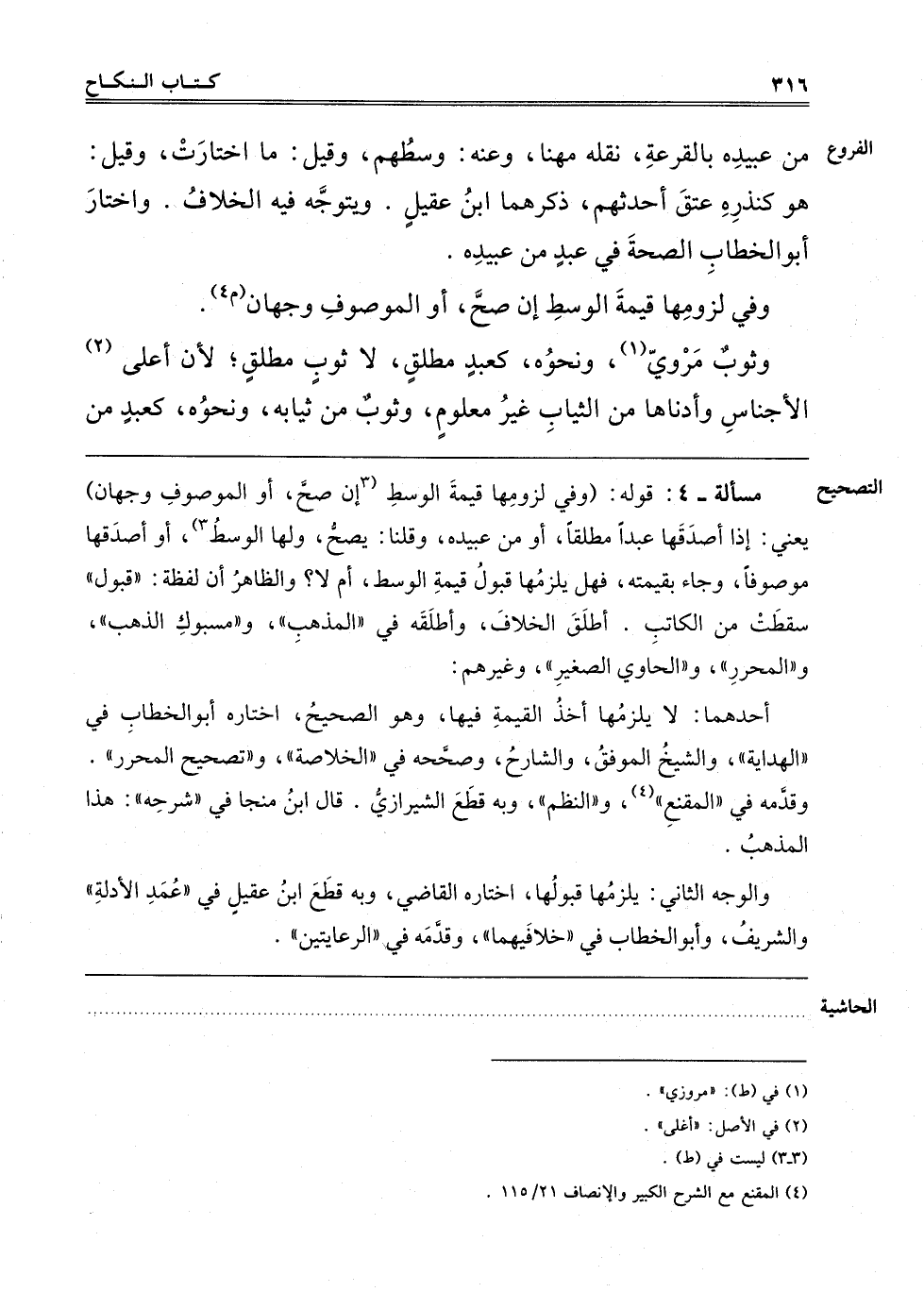 ـــــــــــــــــــــــــــــQمسألة – 4: قوله: "وَفِي لُزُومِهَا قِيمَةَ الْوَسَطِ3 إنْ صَحَّ، أَوْ الموصوف وجهان" يعني: إذا أصدقها عبداً مطلقاً، أو من عبيده، وقلنا: يصح، ولها الْوَسَطِ3، أَوْ أَصْدَقَهَا مَوْصُوفًا وَجَاءَ بِقِيمَتِهِ فَهَلْ يَلْزَمُهَا قَبُولُ قِيمَةِ الْوَسَطِ أَمْ لَا؟ وَالظَّاهِرُ أَنَّ لَفْظَةَ " قَبُولِ " سَقَطَتْ مِنْ الْكَاتِبِ أَطْلَقَ الْخِلَافَ، وَأَطْلَقَهُ فِي الْمُذْهَبِ وَمَسْبُوكِ الذَّهَبِ وَالْمُحَرَّرِ وَالْحَاوِي الصَّغِيرِ وَغَيْرِهِمْ: