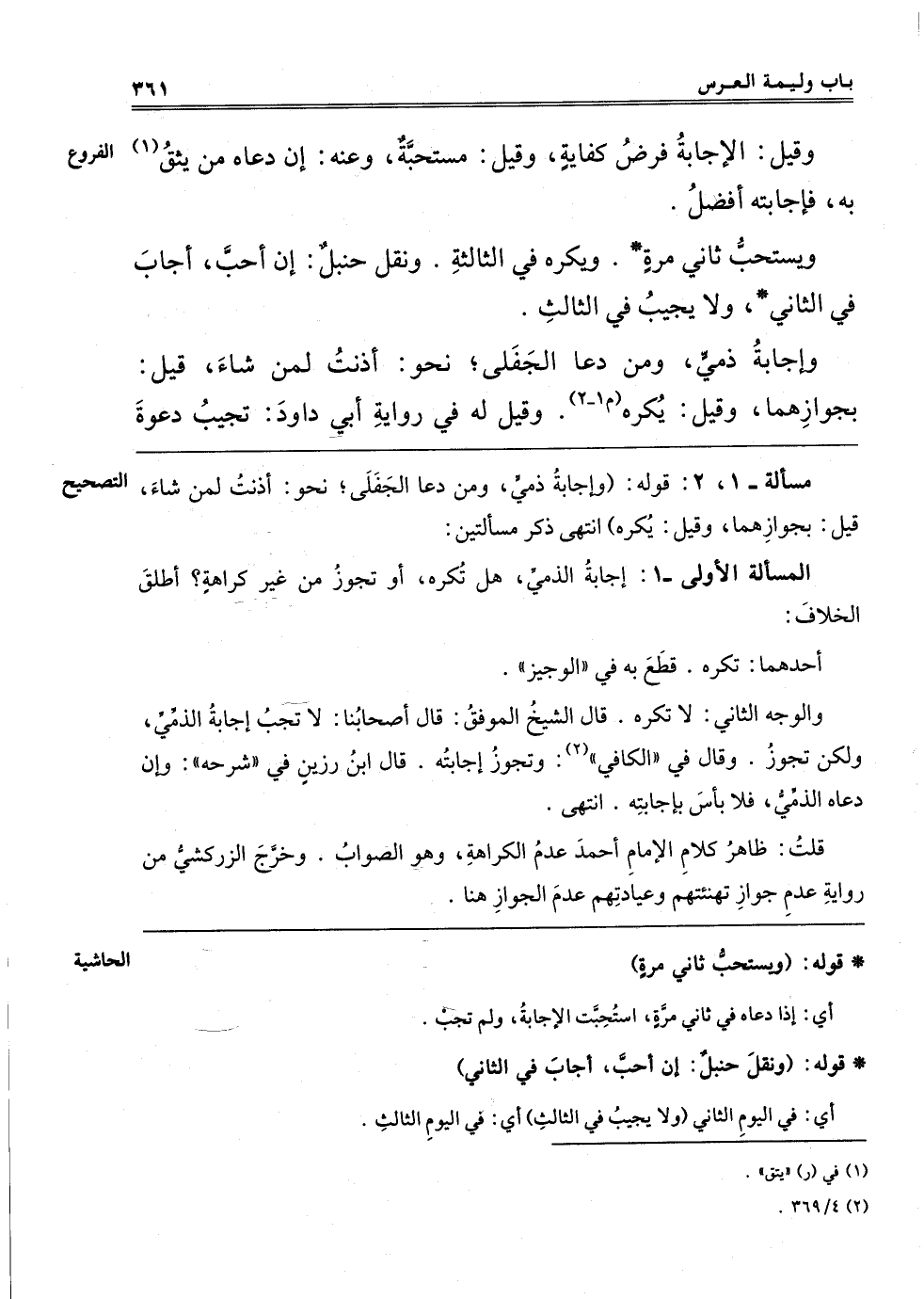 ـــــــــــــــــــــــــــــQمسألة – 1، 2: قَوْلُهُ: "وَإِجَابَةُ ذِمِّيٍّ وَمَنْ دَعَا الْجَفَلَى، نَحْوَ أَذِنْت لِمَنْ شَاءَ، قِيلَ بِجَوَازِهِمَا، وَقِيلَ: يُكْرَهُ" انتهى. ذكر مسألتين: