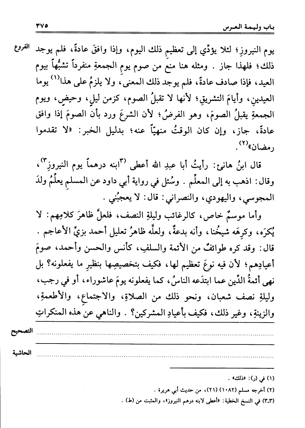 يَوْمَ النَّيْرُوزِ، لِئَلَّا يُؤَدِّيَ إلَى تَعْظِيمِ ذَلِكَ الْيَوْمِ، وَإِذَا وَافَقَ عَادَةً فَلَمْ يُوجَدْ ذَلِكَ، فَلِهَذَا جَازَ وَمِثْلُهُ هُنَا مُنِعَ مِنْ صَوْمِ يَوْمِ الْجُمُعَةِ مُنْفَرِدًا تَشَبُّهًا بِيَوْمِ الْعِيدِ، فَإِذَا صَادَفَ عَادَةً فَلَمْ يُوجَدْ ذَلِكَ الْمَعْنَى، وَلَا يُلْزِمُ عَلَى هَذَا1 يَوْمَا الْعِيدَيْنِ وَأَيَّامُ التَّشْرِيقِ، لِأَنَّهَا لَا تَقْبَلُ الصَّوْمَ، كَزَمَنِ لَيْلٍ وَحَيْضٍ، وَيَوْمُ الْجُمُعَةِ يَقْبَلُ الصَّوْمَ، وَهُوَ الْفَرْضُ، وَلِأَنَّ الشَّرْعَ وَرَدَ بِأَنَّ الصَّوْمَ إذَا وَافَقَ عَادَةً جَازَ وَإِنْ كَانَ الْوَقْتُ مَنْهِيًّا عَنْهُ، بِدَلِيلِ الْخَبَرِ "لَا تَقَدَّمُوا رَمَضَانَ"2.