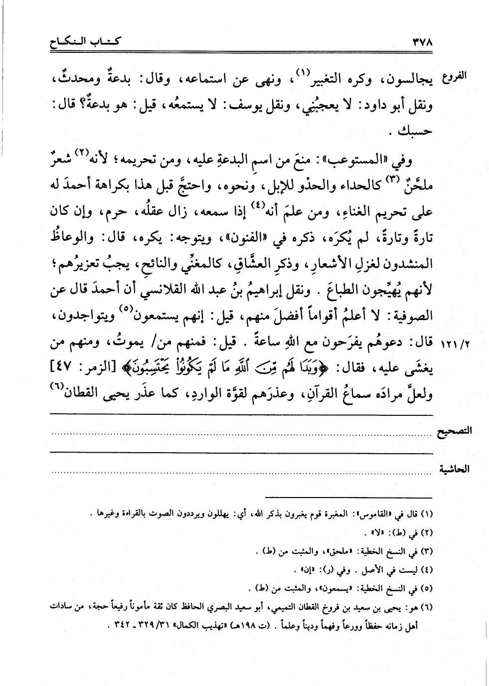 وَفِي الْمُسْتَوْعِبِ مَنَعَ مِنْ اسْمِ البدعة عليه ومن تحريمه، لأنه2 شِعْرٌ مُلَحَّنٌ3 كَالْحِدَاءِ، وَالْحَدْوِ لِلْإِبِلِ وَنَحْوَهُ، وَاحْتَجَّ قَبْلَ هَذَا بِكَرَاهَةِ أَحْمَدَ لَهُ عَلَى تَحْرِيمِ الْغِنَاءِ، وَمَنْ عَلِمَ أَنَّهُ4 إذَا سَمِعَهُ زَالَ عَقْلُهُ حُرِّمَ، وَإِنْ كَانَ تَارَةً وَتَارَةً لَمْ يَكْرَهْ، ذَكَرَهُ فِي الْفُنُونِ، وَيَتَوَجَّهُ: يُكْرَهُ، قَالَ: وَالْوُعَّاظُ الْمُنْشِدُونَ لِغَزَلِ الْأَشْعَارِ وَذِكْرِ الْعُشَّاقِ كَالْمُغَنِّي وَالنَّائِحِ يَجِبُ تَعْزِيرُهُمْ، لِأَنَّهُمْ يُهَيِّجُونَ الطِّبَاعَ. وَنَقَلَ إبْرَاهِيمُ بْنُ عَبْدِ اللَّهِ الْقَلَانِسِيُّ أَنَّ أَحْمَدَ قَالَ عَنْ الصُّوفِيَّةِ: لَا أَعْلَمُ أَقْوَامًا أَفْضَلَ مِنْهُمْ، قِيلَ: إنَّهُمْ يَسْتَمِعُونَ5 وَيَتَوَاجَدُونَ، قَالَ: دَعُوهُمْ يَفْرَحُونَ مَعَ اللَّهِ سَاعَةً، قِيلَ: فَمِنْهُمْ مَنْ يَمُوتُ وَمِنْهُمْ مَنْ يُغْشَى عَلَيْهِ، فَقَالَ: {وَبَدَا لَهُمْ مِنَ اللَّهِ مَا لَمْ يَكُونُوا يَحْتَسِبُونَ} [الزمر: 47] وَلَعَلَّ مُرَادَهُ سَمَاعُ الْقُرْآنِ، وَعَذَّرَهُمْ لِقُوَّةِ الوارد، كما عذر يحيى القطان 6