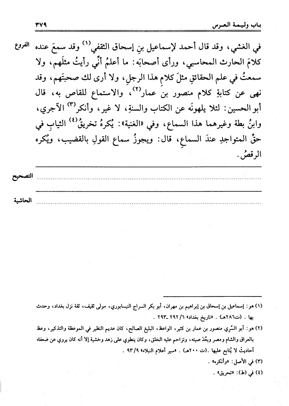 فِي الْغَشْيِ، وَقَدْ قَالَ أَحْمَدُ لِإِسْمَاعِيلَ بْنِ إِسْحَاقَ الثَّقَفِيِّ1 وَقَدْ سَمِعَ عِنْدَهُ كَلَامَ الْحَارِثِ الْمُحَاسِبِيِّ وَرَأَى أَصْحَابَهُ: مَا أَعْلَمُ أَنِّي رَأَيْت مِثْلَهُمْ، وَلَا سَمِعْت فِي عِلْمِ الْحَقَائِقِ مِثْلَ كَلَامِ هَذَا الرَّجُلِ، وَلَا أَرَى لَك صُحْبَتَهُمْ، وَقَدْ نَهَى عَنْ كِتَابَةِ كَلَامِ مَنْصُورِ بْنِ عَمَّارٍ2 وَالِاسْتِمَاعِ لِلْقَاصِّ بِهِ قَالَ أَبُو الْحُسَيْنِ: لِئَلَّا يُلْهُونَهُ عَنْ الْكِتَابِ وَالسُّنَّةِ لَا غَيْرُ، وَأَنْكَرَ3 الْآجُرِّيُّ وَابْنُ بَطَّةَ وَغَيْرُهُمَا هَذَا السَّمَاعَ. وَفِي الْغُنْيَةِ: يُكْرَهُ تَحْرِيقُ4 الثِّيَابِ فِي حَقِّ الْمُتَوَاجِدِ عِنْدَ السَّمَاعِ، قَالَ: وَيَجُوزُ سَمَاعُ الْقَوْلِ بالقضيب، ويكره الرقص.
