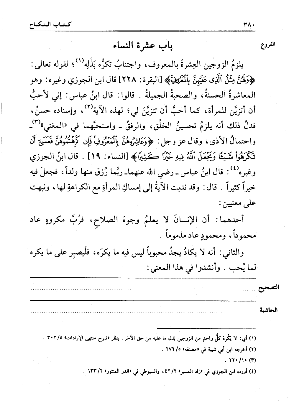 يَلْزَمُ الزَّوْجَيْنِ الْعِشْرَةُ بِالْمَعْرُوفِ، وَاجْتِنَابُ تَكَرُّهِ بَذْلِهِ1 لِقَوْلِهِ تَعَالَى: {وَلَهُنَّ مِثْلُ الَّذِي عَلَيْهِنَّ بِالْمَعْرُوفِ} [البقرة: 228] قَالَ ابْنُ الْجَوْزِيِّ وَغَيْرُهُ: وَهُوَ الْمُعَاشَرَةُ الْحَسَنَةُ وَالصُّحْبَةُ الْجَمِيلَةُ. قَالُوا: قَالَ ابْنُ عَبَّاسٍ: إنِّي لَأُحِبُّ أَنْ أَتَزَيَّنَ لِلْمَرْأَةِ كَمَا أُحِبُّ أَنْ تَتَزَيَّنَ لِي، لِهَذِهِ الْآيَةِ2 وَإِسْنَادُهُ حَسَنٌ، فَدَلَّ ذَلِكَ أَنَّهُ يَلْزَمُ تَحْسِينُ الْخُلُقِ وَالرِّفْقُ، وَاسْتَحَبَّهُمَا فِي الْمُغْنِي3. وَاحْتِمَالُ الْأَذَى، وَقَالَ عَزَّ وَجَلَّ {وَعَاشِرُوهُنَّ بِالْمَعْرُوفِ فَإِنْ كَرِهْتُمُوهُنَّ فَعَسَى أَنْ تَكْرَهُوا شَيْئاً وَيَجْعَلَ اللَّهُ فِيهِ خَيْراً كَثِيراً} [النساء: 19] قَالَ ابْنُ الْجَوْزِيِّ وَغَيْرُهُ4: قَالَ ابْنُ عَبَّاسٍ: رَضِيَ اللَّهُ عَنْهُمَا رُبَّمَا رُزِقَ مِنْهَا وَلَدًا فَجُعِلَ فِيهِ خَيْرًا كَثِيرًا. قَالَ: وَقَدْ نَدَبَتْ الْآيَةُ إلَى إمْسَاكِ الْمَرْأَةِ مَعَ الْكَرَاهَةِ لَهَا، وَنَبَّهْت عَلَى مَعْنَيَيْنِ: