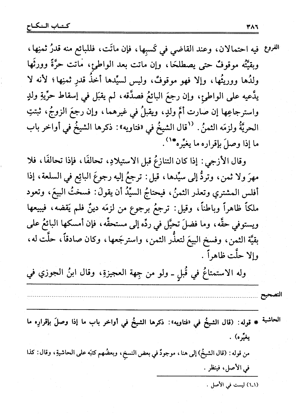 فِيهِ احْتِمَالَانِ، وَعِنْدَ الْقَاضِي فِي كَسْبِهَا، فَإِنْ مَاتَتْ فَلِلْبَائِعِ مِنْهُ قَدْرُ ثَمَنِهَا وَبَقِيَّتُهُ مَوْقُوفٌ حَتَّى يَصْطَلِحَا، وَإِنْ مَاتَتْ بَعْدَ الْوَاطِئِ مَاتَتْ حُرَّةً وَوَرِثَهَا وَلَدُهَا وَوَرِيثُهَا، وَإِلَّا فَهُوَ مَوْقُوفٌ، وَلَيْسَ لِسَيِّدِهَا أَخْذُ قَدْرِ ثَمَنِهَا، لِأَنَّهُ لَا يَدَّعِيهِ عَلَى الْوَاطِئِ وَإِنْ رَجَعَ الْبَائِعُ فَصَدَّقَهُ لَمْ يُقْبَلْ فِي إسْقَاطِ حُرِّيَّةِ وَلَدٍ وَاسْتِرْجَاعِهَا إنْ صَارَتْ أُمَّ وَلَدٍ، وَيُقْبَلُ فِي غَيْرِهِمَا، وَإِنْ رَجَعَ الزَّوْجُ ثَبَتَتْ الْحُرِّيَّةُ وَلَزِمَهُ الثَّمَنُ، 1قَالَ الشَّيْخُ فِي فَتَاوِيهِ: ذَكَرَهَا الشَّيْخُ فِي أَوَاخِرِ بَابِ مَا إذَا وَصَلَ بِإِقْرَارِهِ مَا يُغَيِّرُهُ1.