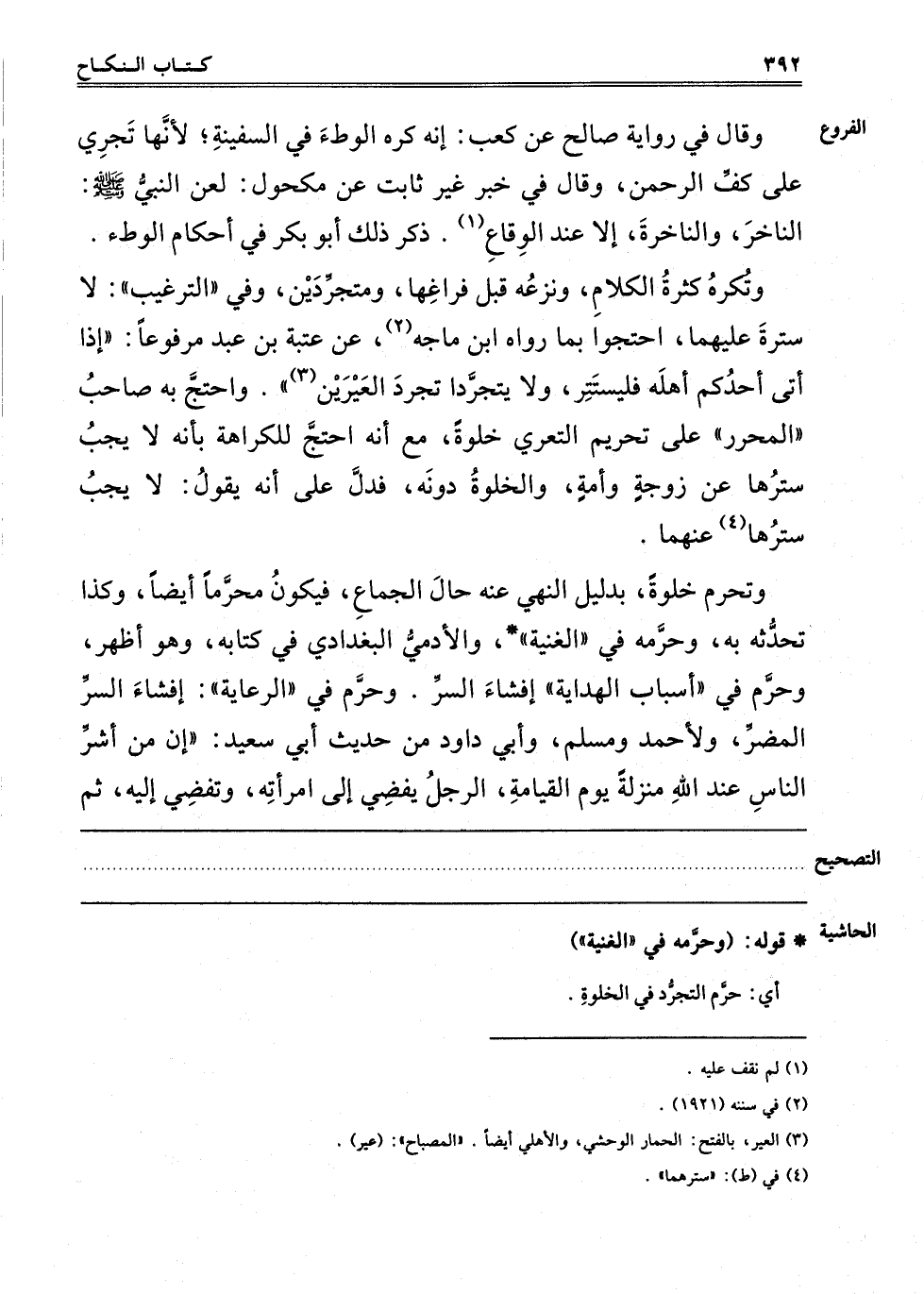 وَتُحَرَّمُ خَلْوَةً، بِدَلِيلِ النَّهْيِ عَنْهُ حَالَ الْجِمَاعِ، فَيَكُونُ مُحَرَّمًا أَيْضًا، وَكَذَا تَحَدُّثُهُ بِهِ، وَحَرَّمَهُ فِي الْغُنْيَةِ وَالْآدَمِيِّ الْبَغْدَادِيِّ فِي كِتَابِهِ، وَهُوَ أَظْهَرُ. وَحَرَّمَ فِي أَسْبَابِ الْهِدَايَةِ إفْشَاءَ السِّرِّ. وَحَرَّمَ فِي الرِّعَايَةِ، إفْشَاءَ السِّرِّ الْمُضِرِّ، وَلِأَحْمَدَ وَمُسْلِمٍ وَأَبِي دَاوُد مِنْ حَدِيثِ أَبِي سَعِيدٍ "إنَّ مِنْ أَشَرِّ النَّاسِ عِنْدَ اللَّهِ مَنْزِلَةً يَوْمَ الْقِيَامَةِ الرَّجُلُ يُفْضِي إلَى امْرَأَتِهِ وتفضي إليه ثم