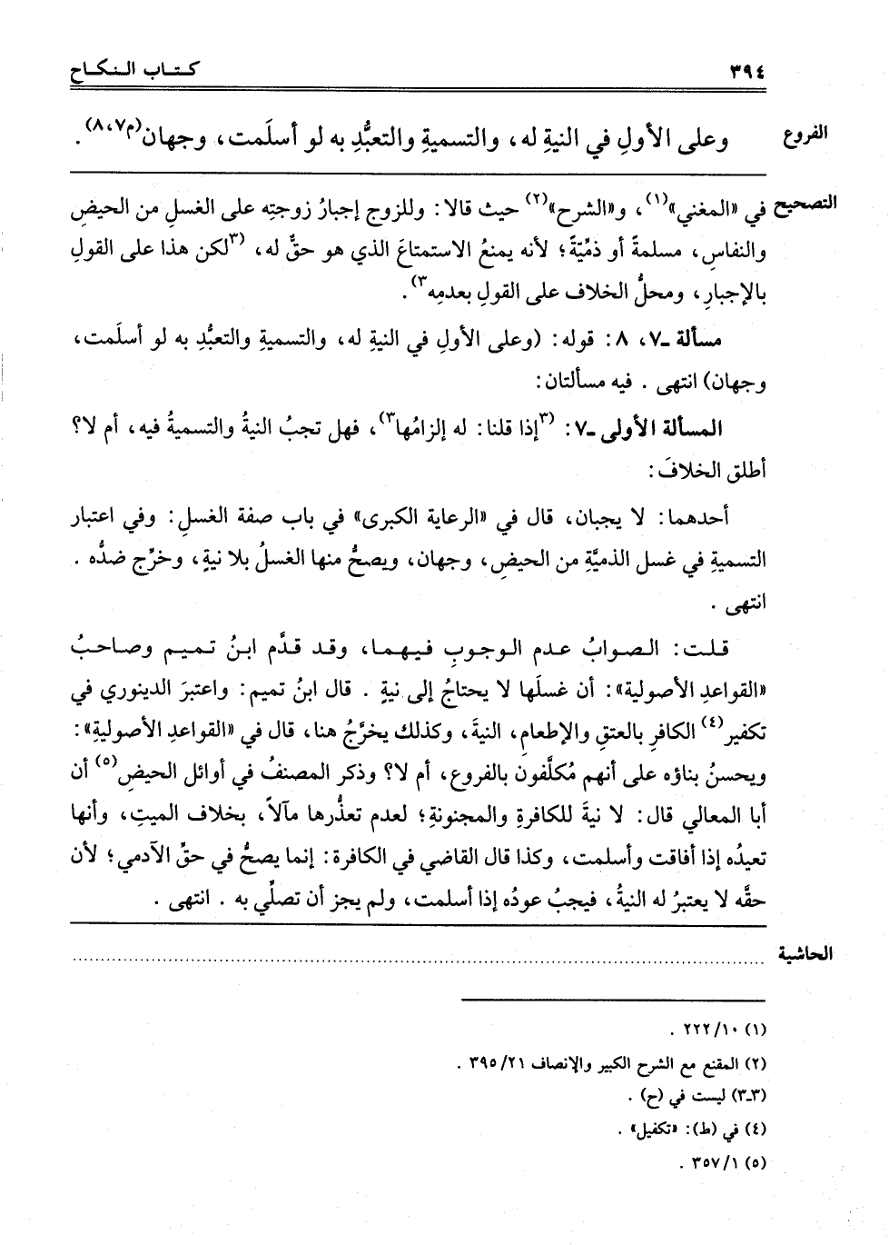 قُلْت: الصَّوَابُ عَدَمُ الْوُجُوبِ فِيهِمَا، وَقَدْ قَدَّمَ ابْنُ تَمِيمٍ وَصَاحِبُ الْقَوَاعِدِ الْأُصُولِيَّةِ أَنَّ غُسْلَهَا لَا يَحْتَاجُ إلَى نِيَّةٍ، قَالَ ابن تميم: واعتبر الدينوري في تكفير4 الْكَافِرِ بِالْعِتْقِ وَالْإِطْعَامِ النِّيَّةَ، وَكَذَلِكَ يُخَرَّجُ هُنَا، قال في القواعد الأصولية: وَيَحْسُنُ بِنَاؤُهُ عَلَى أَنَّهُمْ مُكَلَّفُونَ بِالْفُرُوعِ أَمْ لَا؟ وَذَكَرَ الْمُصَنِّفُ فِي أَوَائِلِ الْحَيْضِ5 أَنَّ أَبَا الْمَعَالِي قَالَ: لَا نِيَّةَ لِلْكَافِرَةِ وَالْمَجْنُونَةِ، لِعَدَمِ تَعَذُّرِهَا مَآلًا، بِخِلَافِ الْمَيِّتِ، وَأَنَّهَا تُعِيدُهُ إذَا أَفَاقَتْ وَأَسْلَمَتْ، وَكَذَا قَالَ الْقَاضِي فِي الْكَافِرَةِ: إنَّمَا يَصِحُّ فِي حَقِّ الْآدَمِيِّ؛ لِأَنَّ حَقَّهُ لَا يُعْتَبَرُ لَهُ النِّيَّةُ، فَيَجِبُ عَوْدُهُ إذَا أَسْلَمَتْ، وَلَمْ يَجُزْ أَنْ تُصَلِّيَ بِهِ، انتهى.