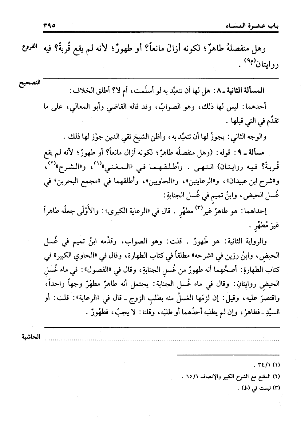 مَسْأَلَةٌ- 9: قَوْلُهُ: "وَهَلْ مُنْفَصِلُهُ طَاهِرٌ لِكَوْنِهِ أَزَالَ مَانِعًا؟ أَوْ طَهُورٌ لِأَنَّهُ لَمْ يَقَعْ قُرْبَةً؟ فِيهِ رِوَايَتَانِ"، انْتَهَى. وَأَطْلَقَهُمَا فِي الْمُغْنِي1 وَالشَّرْحِ2 وَشَرْحِ ابْنِ عُبَيْدَانَ وَالرِّعَايَتَيْنِ وَالْحَاوِيَيْنِ، وَأَطْلَقَهُمَا فِي مَجْمَعِ الْبَحْرَيْنِ فِي غُسْلٍ فِي الْحَيْضِ، وَابْنُ تَمِيمٍ فِي غُسْلِ الْجَنَابَةِ: