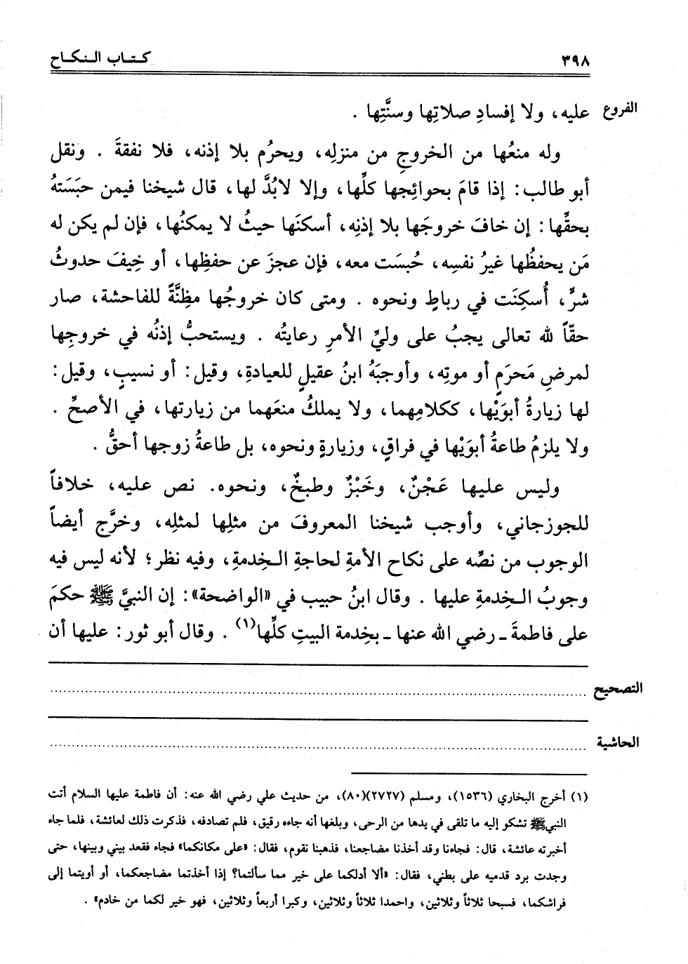وَلَيْسَ عَلَيْهَا عَجْنٌ وَخَبْزٌ وَطَبْخٌ وَنَحْوَهُ، نَصَّ عَلَيْهِ، خِلَافًا لِلْجُوزَجَانِيِّ، وَأَوْجَبَ شَيْخُنَا الْمَعْرُوفَ "مِنْ" مِثْلِهَا لِمِثْلِهِ، وَخَرَّجَ أَيْضًا الْوُجُوبَ مِنْ نَصِّهِ عَلَى نِكَاحِ الْأَمَةِ لِحَاجَةِ الْخِدْمَةِ، وَفِيهِ نَظَرٌ، لِأَنَّهُ لَيْسَ فِيهِ وُجُوبُ الْخِدْمَةِ عَلَيْهَا. وَقَالَ ابْنُ حَبِيبٍ فِي الْوَاضِحَةِ: إنَّ النَّبِيَّ صَلَّى اللَّهُ عَلَيْهِ وَسَلَّمَ حَكَمَ عَلَى فَاطِمَةَ رَضِيَ اللَّهُ عَنْهَا بِخِدْمَةِ الْبَيْتِ كُلِّهَا1. وَقَالَ أبو ثور: عليها أن