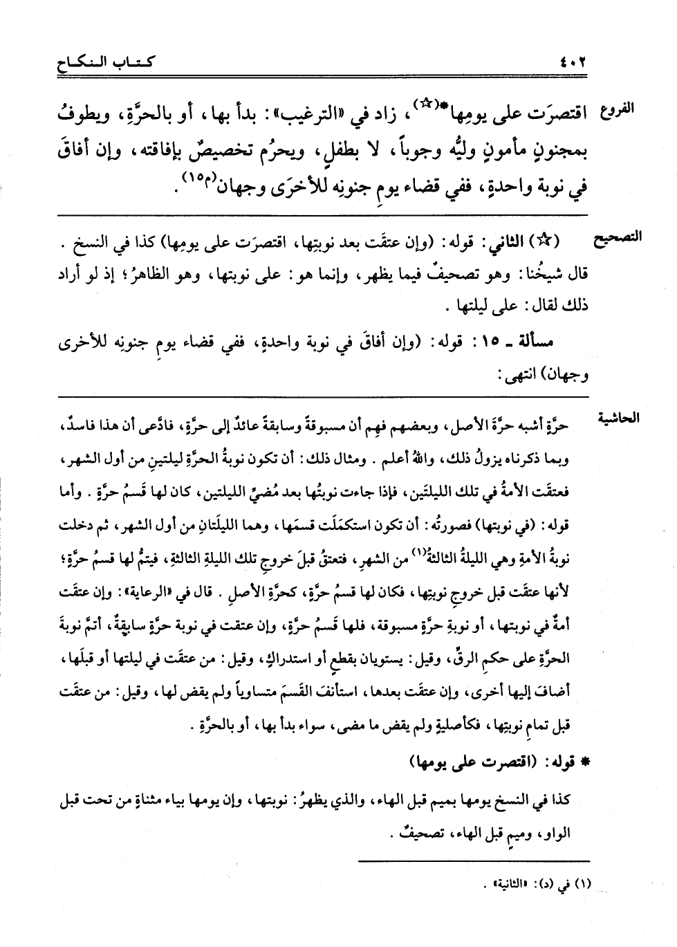 ـــــــــــــــــــــــــــــQالثَّانِي: قَوْلُهُ: "وَإِنْ عَتَقَتْ بَعْدَ نَوْبَتِهَا اقْتَصَرَتْ عَلَى يَوْمِهَا"، كَذَا فِي النُّسَخِ، قَالَ شَيْخُنَا: وَهُوَ تَصْحِيفٌ فِيمَا يَظْهَرُ، وَإِنَّمَا هُوَ " عَلَى نَوْبَتِهَا "، وَهُوَ الظَّاهِرُ، إذْ لَوْ أَرَادَ ذَلِكَ لقال: "على ليلتها".