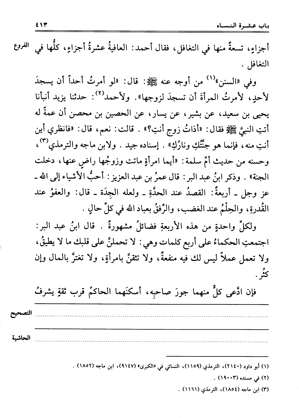 وَفِي السُّنَنِ1 مِنْ أَوْجُهٍ عَنْهُ صَلَّى اللَّهُ عَلَيْهِ وَسَلَّمَ قَالَ: "لَوْ أَمَرْت أَحَدًا أَنْ يَسْجُدَ لِأَحَدٍ لَأَمَرْت الْمَرْأَةَ أَنْ تَسْجُدَ لِزَوْجِهَا". وَلِأَحْمَدَ2: حَدَّثَنَا يَزِيدُ أَنْبَأَنَا يَحْيَى بْنُ سَعِيدٍ عَنْ بَشِيرٍ عَنْ يَسَارٍ عَنْ الْحُصَيْنِ بْنِ مُحْصِنٍ أَنَّ عَمَّةً لَهُ أَتَتْ النَّبِيَّ صَلَّى اللَّهُ عَلَيْهِ وَسَلَّمَ فَقَالَ: "ذَاتَ زَوْجٍ أَنْتِ؟ " قَالَتْ: نَعَمْ، قَالَ: "فَانْظُرِي أَيْنَ أَنْتِ مِنْهُ، فَإِنَّمَا هُوَ جَنَّتُك وَنَارُك" إسْنَادُهُ جَيِّدٌ. وَلِابْنِ مَاجَهْ وَالتِّرْمِذِيِّ3 وَحَسَّنَهُ مِنْ حَدِيثِ أُمِّ سَلَمَةَ: "أَيُّمَا امْرَأَةٍ مَاتَتْ وَزَوْجُهَا رَاضٍ عَنْهَا دَخَلَتْ الْجَنَّةَ" وَذَكَرَ ابْنُ عَبْدِ الْبَرِّ: قَالَ عُمَرُ بْنُ عَبْدِ الْعَزِيزِ: أَحَبُّ الْأَشْيَاءِ إلَى اللَّهِ عَزَّ وَجَلَّ أَرْبَعَةٌ: الْقَصْدُ عِنْدَ الْحِدَّةِ وَلَعَلَّهُ الْجِدَّةُ قَالَ: وَالْعَفْوُ عِنْدَ الْقُدْرَةِ، وَالْحِلْمُ عِنْدَ الْغَضَبِ، وَالرِّفْقُ بِعِبَادِ اللَّهِ فِي كُلِّ حَالٍ.