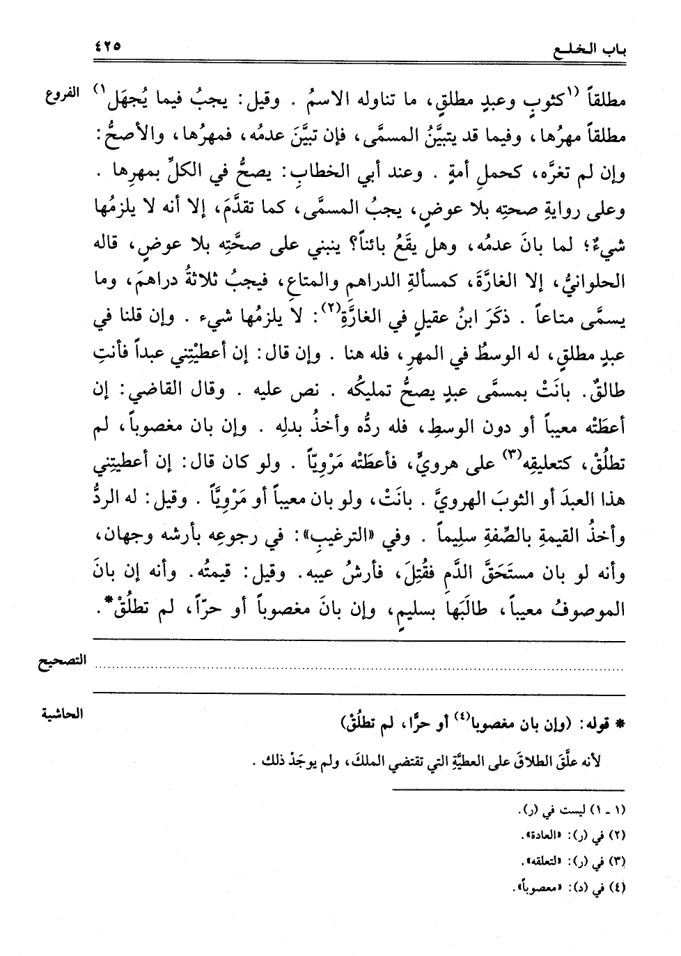 مُطْلَقًا، 1كَثَوْبٍ وَعَبْدٍ مُطْلَقٍ مَا تَنَاوَلَهُ الِاسْمُ، وَقِيلَ: يَجِبُ فِيمَا يَجْهَلُ1 مُطْلَقًا مَهْرُهَا، وَفِيمَا قَدْ يَتَبَيَّنُ الْمُسَمَّى، فَإِنْ تَبَيَّنَ عَدَمُهُ فَمَهْرُهَا، وَالْأَصَحُّ: وَإِنْ لَمْ تَغُرَّهُ كَحَمْلِ أَمَةٍ، وَعِنْدَ أَبِي الْخَطَّابِ: يَصِحُّ فِي الْكُلِّ بِمَهْرِهَا، وَعَلَى رِوَايَةٍ صِحَّتُهُ بِلَا عِوَضٍ يَجِبُ الْمُسَمَّى، كَمَا تَقَدَّمَ، إلَّا أَنَّهُ لَا يَلْزَمُهَا شَيْءٌ، لِمَا بَانَ عَدَمُهُ، وَهَلْ يَقَعُ بَائِنًا؟ يَنْبَنِي عَلَى صِحَّتِهِ بِلَا عِوَضٍ، قَالَهُ الْحَلْوَانِيُّ، إلَّا الْغَارَةَ كَمَسْأَلَةِ الدَّرَاهِمِ وَالْمَتَاعِ، فَيَجِبُ ثَلَاثَةُ دَرَاهِمَ، وَمَا يُسَمَّى مَتَاعًا، ذَكَرَ ابْنُ عَقِيلٍ فِي الْغَارَةِ2: لَا يَلْزَمُهَا شَيْءٌ، وَإِنْ قُلْنَا فِي عَبْدٍ مُطْلَقٍ: لَهُ الْوَسَطُ فِي الْمَهْرِ، فَلَهُ هُنَا. وَإِنْ قَالَ: إنْ أَعْطَيْتنِي عَبْدًا فَأَنْتِ طَالِقٌ بَانَتْ بِمُسَمَّى عَبْدٍ يَصِحُّ تَمْلِيكُهُ، نَصَّ عَلَيْهِ. وَقَالَ الْقَاضِي: إنْ أَعْطَتْهُ مَعِيبًا أَوْ دُونَ الْوَسَطِ فَلَهُ رَدُّهُ وَأَخْذُ بَدَلِهِ، وَإِنْ بَانَ مَغْصُوبًا لَمْ تَطْلُقْ، كَتَعْلِيقِهِ3 عَلَى هَرَوِيٍّ فَأَعْطَتْهُ مَرْوِيًّا، وَلَوْ كَانَ قَالَ: إنْ أَعْطَيْتنِي هَذَا الْعَبْدَ أَوْ الثَّوْبَ الْهَرَوِيَّ بَانَتْ وَلَوْ بَانَ مَعِيبًا أَوْ مَرْوِيًّا، وَقِيلَ: لَهُ الرَّدُّ وَأَخْذُ الْقِيمَةِ بِالصِّفَةِ سَلِيمًا. وَفِي التَّرْغِيبِ: فِي رُجُوعِهِ بِأَرْشِهِ وَجْهَانِ. وَأَنَّهُ لَوْ بَانَ مُسْتَحِقَّ الدَّمَ فَقُتِلَ فَأَرْشُ عَيْبِهِ، وَقِيلَ: قِيمَتِهِ، وَأَنَّهُ إنْ بَانَ الْمَوْصُوفُ مَعِيبًا طَالَبَهَا بِسَلِيمٍ، وَإِنْ بَانَ مغصوبا أو حرا لم تطلق.
