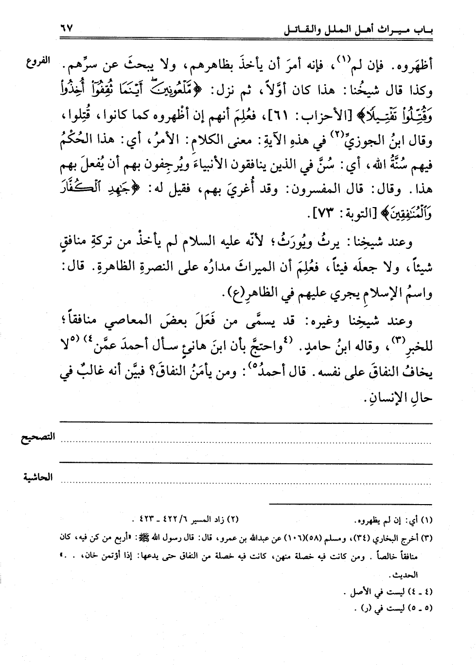 وَعِنْدَ شَيْخِنَا: يَرِثُ وَيُورَثُ؛ لِأَنَّهُ عَلَيْهِ السَّلَامُ لَمْ يَأْخُذْ مِنْ تَرِكَةِ مُنَافِقٍ شَيْئًا وَلَا جَعَلَهُ فَيْئًا، فَعُلِمَ أَنَّ الْمِيرَاثَ مَدَارُهُ عَلَى النُّصْرَةِ الظَّاهِرَةِ، قَالَ: وَاسْمُ الْإِسْلَامِ يَجْرِي عَلَيْهِمْ فِي الظَّاهِرِ "ع".