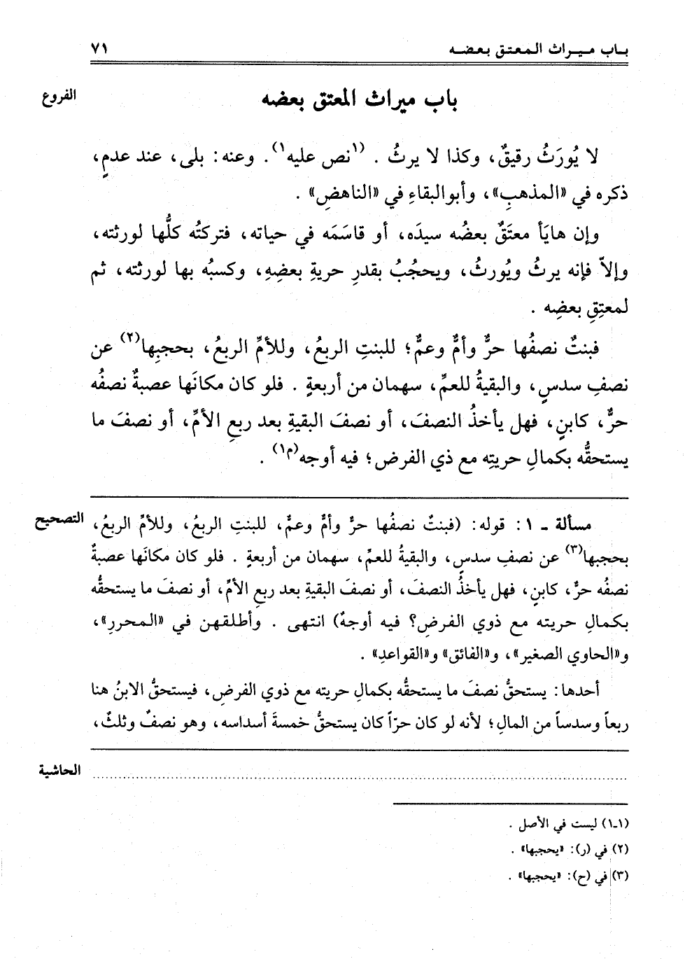 ـــــــــــــــــــــــــــــQمَسْأَلَةٌ -1: قَوْلُهُ: "فَبِنْتٌ نِصْفُهَا حُرٌّ وَأُمٌّ وَعَمٌّ، لِلْبِنْتِ الرُّبُعُ، وَلِلْأُمِّ الرُّبُعُ يَحْجُبُهَا3 عَنْ نِصْفِ سُدُسٍ، وَالْبَقِيَّةُ لِلْعَمِّ سَهْمَانِ مِنْ أَرْبَعَةٍ، فَلَوْ كَانَ مَكَانَهَا عَصَبَةٌ نِصْفُهُ حُرٌّ كَابْنٍ فَهَلْ يَأْخُذُ النِّصْفَ أَوْ نِصْفَ الْبَقِيَّةِ بَعْدَ رُبُعِ الْأُمِّ أَوْ نِصْفَ مَا يَسْتَحِقُّهُ بِكَمَالِ حُرِّيَّتِهِ مَعَ ذَوِي الْفَرْضِ؟ فِيهِ أَوْجُهٌ". انْتَهَى. وَأَطْلَقَهُنَّ فِي الْمُحَرَّرِ وَالْحَاوِي الصَّغِيرِ وَالْفَائِقِ وَالْقَوَاعِدِ.