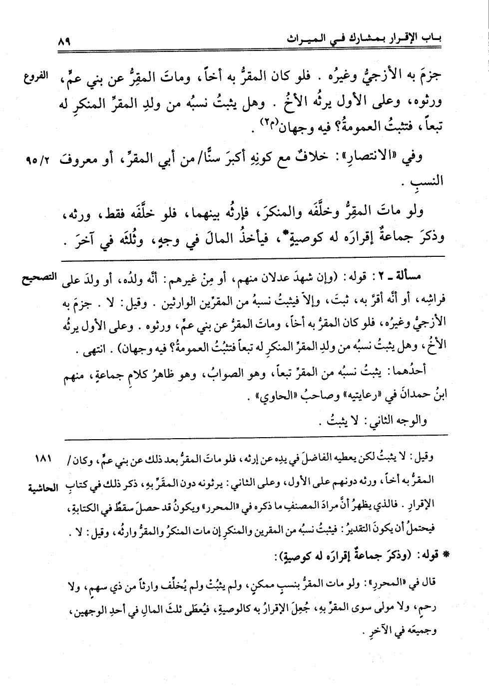 جَزَمَ بِهِ الْأَزَجِيُّ وَغَيْرُهُ، فَلَوْ كَانَ الْمُقِرُّ بِهِ أَخًا وَمَاتَ الْمُقِرُّ عَنْ بَنِي عَمٍّ وَرِثُوهُ، وَعَلَى الْأَوَّلِ يَرِثُهُ الْأَخُ، وَهَلْ يَثْبُتُ نَسَبُهُ مِنْ وَلَدِ الْمُقِرِّ الْمُنْكِرِ لَهُ تَبَعًا فَتَثْبُتُ الْعُمُومَةُ؟ فِيهِ وَجْهَانِ "م 2".