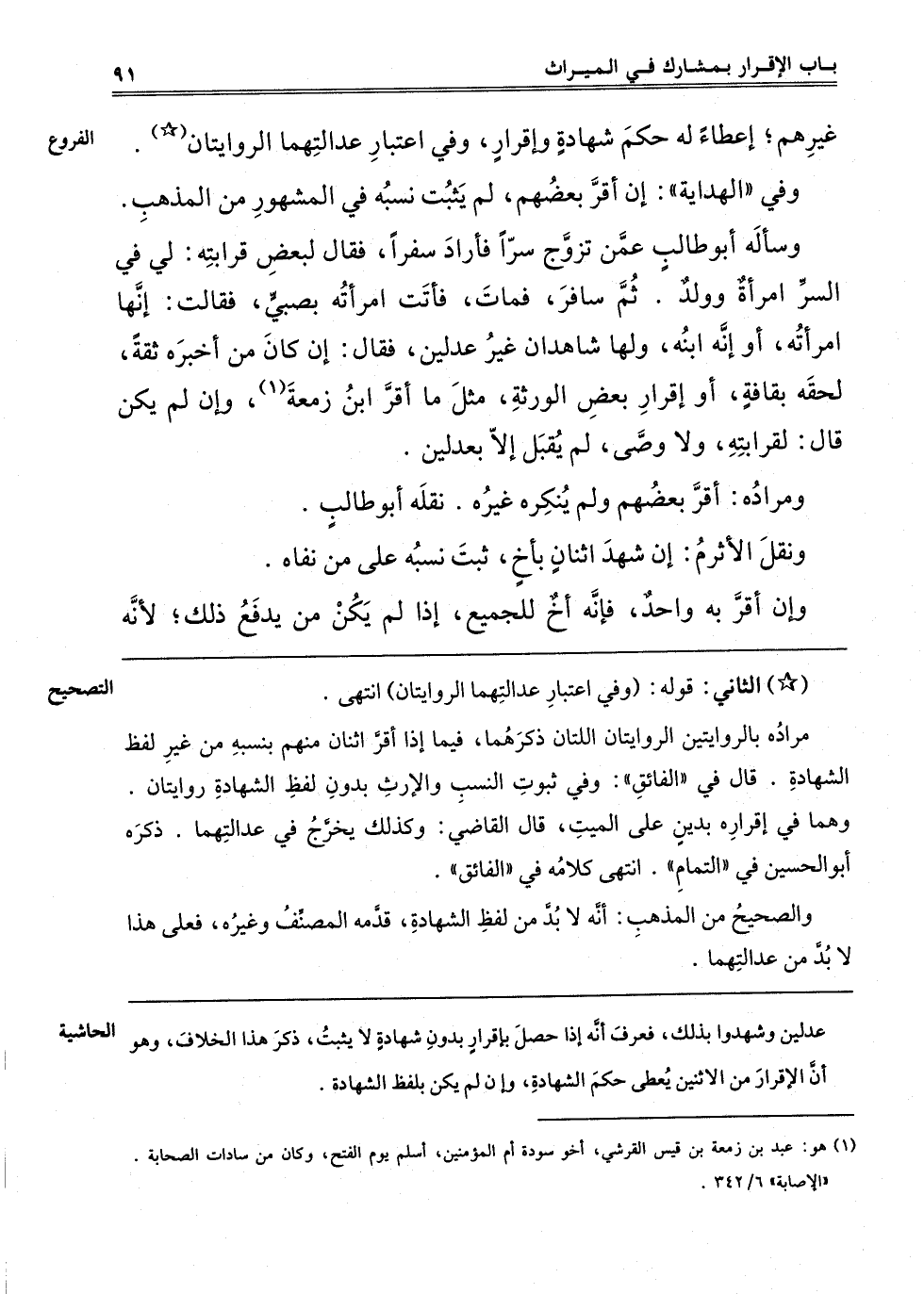 وَفِي الْهِدَايَةِ: إنْ أَقَرَّ بعضهم لَمْ يَثْبُتْ نَسَبُهُ فِي الْمَشْهُورِ مِنْ الْمَذْهَبِ وَسَأَلَهُ أَبُو طَالِبٍ عَمَّنْ تَزَوَّجَ سِرًّا فَأَرَادَ سَفَرًا فَقَالَ لِبَعْضِ قَرَابَتِهِ: لِي فِي السِّرِّ امْرَأَةٌ وَوَلَدٌ، ثُمَّ سَافَرَ فَمَاتَ، فَأَتَتْ امْرَأَتُهُ بِصَبِيٍّ فَقَالَتْ [إنَّهَا امْرَأَتُهُ وَ] إنَّهُ ابْنُهُ، وَلَهَا شَاهِدَانِ غَيْرُ عَدْلَيْنِ، فَقَالَ: إنْ كَانَ مَنْ أَخْبَرَهُ ثِقَةً لَحِقَهُ بِقَافَةٍ أَوْ إقْرَارِ بَعْضِ الْوَرَثَةِ مِثْلُ مَا أَقَرَّ ابْنُ زَمْعَةَ1، وَإِنْ لَمْ يَكُنْ قَالَ لِقَرَابَتِهِ وَلَا وَصِيَّ لَمْ يُقْبَلْ إلَّا بِعَدْلَيْنِ.