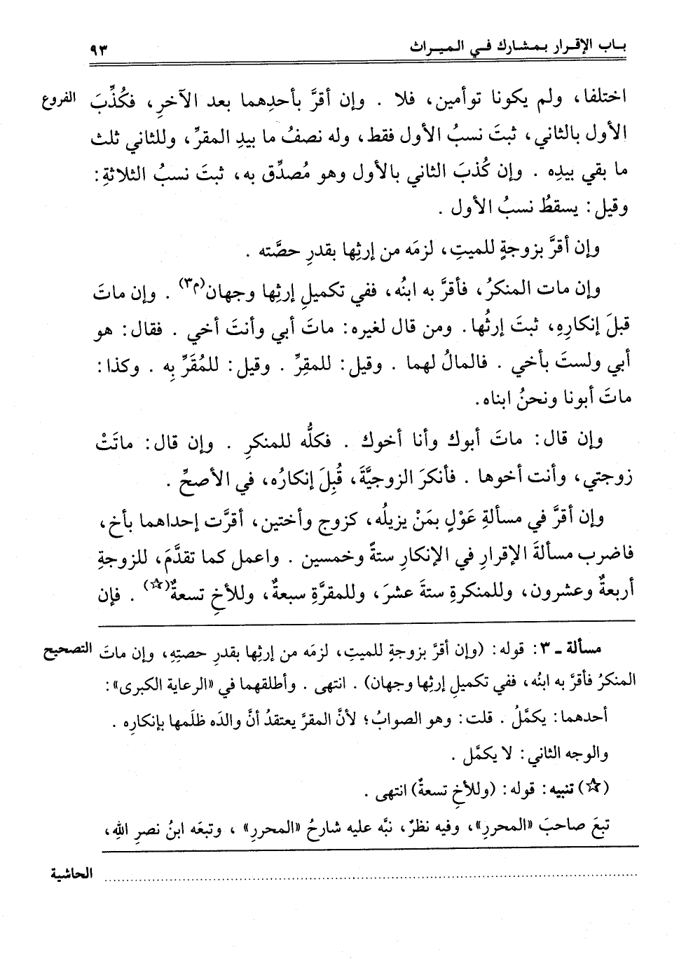 ـــــــــــــــــــــــــــــQمَسْأَلَةٌ – 3: قَوْلُهُ: "وَإِنْ أَقَرَّ بِزَوْجَةٍ لِلْمَيِّتِ لَزِمَهُ مِنْ إرْثِهَا بِقَدْرِ حِصَّتِهِ، وَإِنْ مَاتَ الْمُنْكِرُ فَأَقَرَّ بِهِ ابْنُهُ فَفِي تَكْمِيلِ إرْثِهَا وَجْهَانِ". انْتَهَى. وَأَطْلَقَهُمَا فِي الرِّعَايَةِ الْكُبْرَى.