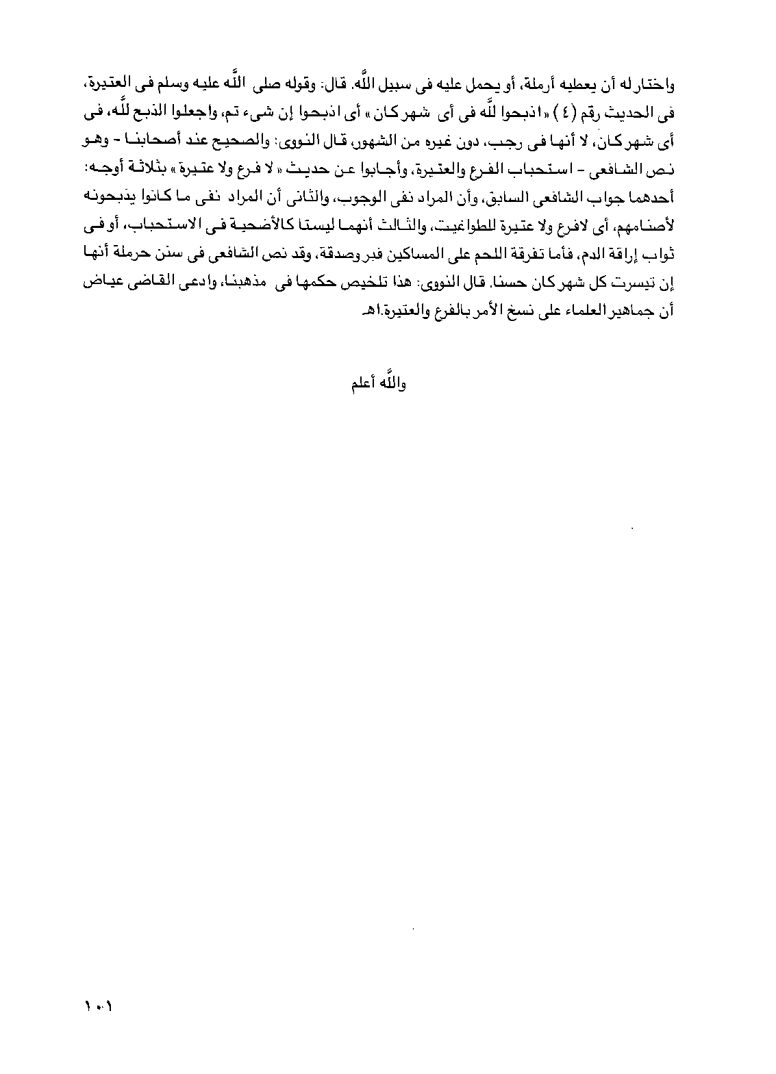 واختار له أن يعطيه أرملة، أو يحمل عليه في سبيل الله. قال: وقوله صلى الله عليه وسلم في العتيرة، في الحديث رقم (4) "اذبحوا لله في أي شهر كان" أي اذبحوا إن شيء تم، واجعلوا الذبح لله، في أي شهر كان، لا أنها في رجب، دون غيره من الشهور، قال النووي: والصحيح عند أصحابنا -وهو نص الشافعي- استحباب الفرع والعتيرة، وأجابوا عن حديث "لا فرع ولا عتيرة" بثلاثة أوجه: أحدهما جواب الشافعي السابق، وأن المراد نفي الوجوب، والثاني أن المراد نفي ما كانوا يذبحونه لأصنامهم، أي لا فرع ولا عتيرة للطواغيت، والثالث أنهما ليستا كالأضحية في الاستحباب، أو في ثواب إراقة الدم، فأما تفرقة اللحم على المساكين فبر وصدقة، وقد نص الشافعي في سنن حرملة أنها إن تيسرت كل شهر كان حسناً. قال النووي: هذا تلخيص حكمها في مذهبنا، وادعى القاضي عياض أن جماهير العلماء على نسخ الأمر بالفرع والعتيرة. اهـ