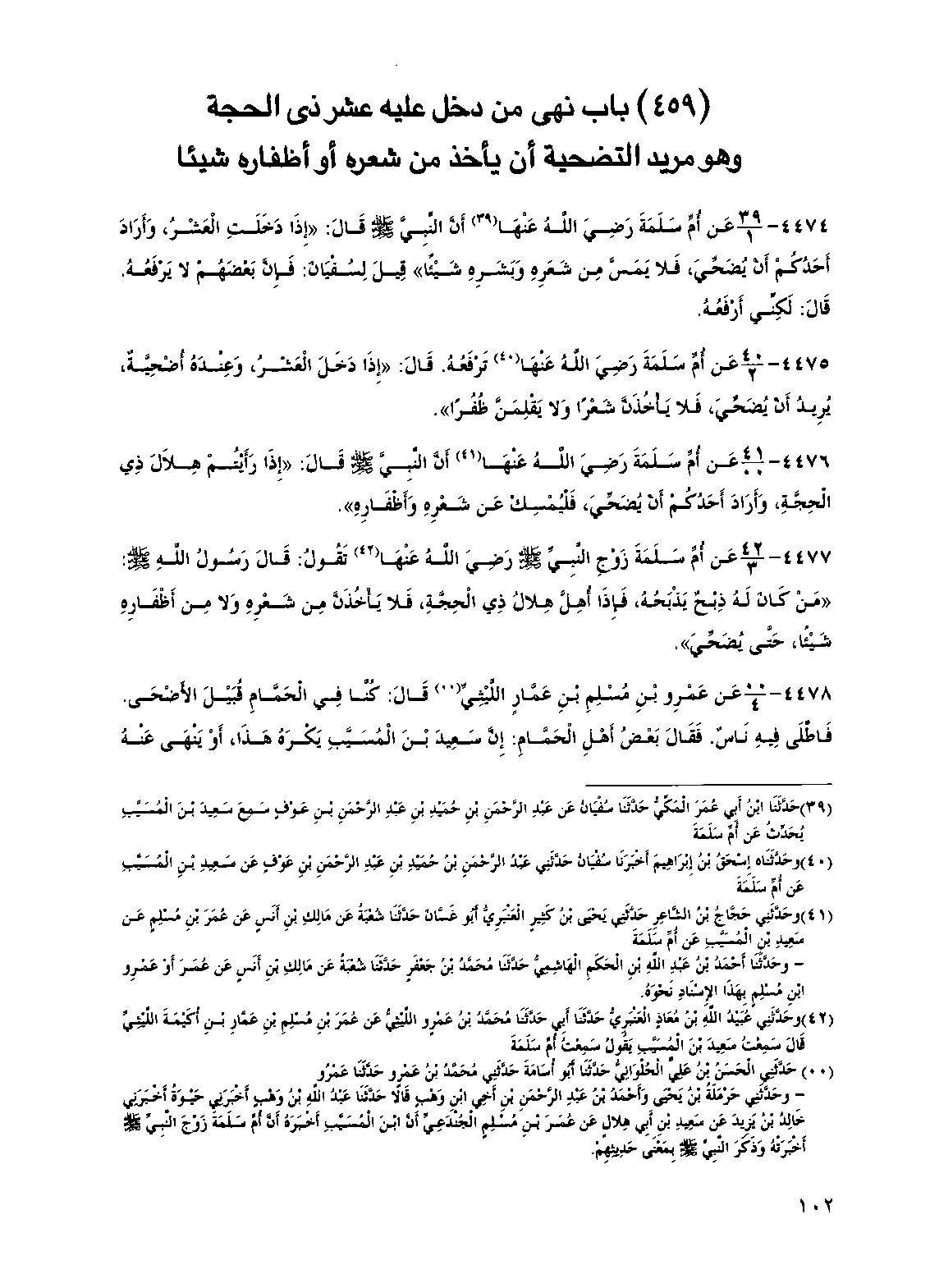 4476 - عن أم سلمة رضي الله عنها أن النبي صلى الله عليه وسلم قال: "إذا رأيتم هلال ذي الحجة، وأراد أحدكم أن يضحي، فليمسك عن شعره وأظفاره".