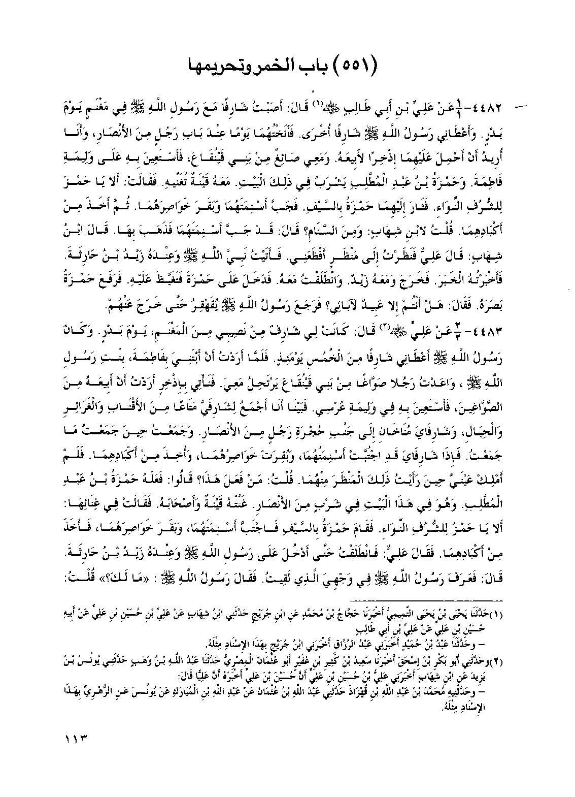 4482 - عن علي بن أبي طالب رضي الله عنه قال: أصبت شارفاً مع رسول الله صلى الله عليه وسلم في مغنم يوم بدر. وأعطاني رسول الله صلى الله عليه وسلم شارفاً أخرى. فأنختهما يوماً عند باب رجل من الأنصار، وأنا أريد أن أحمل عليهما إذخراً لأبيعه. ومعي صائغ من بني قينقاع، فأستعين به على وليمة فاطمة. وحمزة بن عبد المطلب يشرب في ذلك البيت. معه قينة تغنيه. فقالت: 4 ألا يا حمز للشرف النواء فثار إليهما حمزة بالسيف. فجب أسنمتهما وبقر خواصرهما. ثم أخذ من أكبادهما. قلت لابن شهاب: ومن السنام؟ قال: قد جب أسنمتهما فذهب بها. قال ابن شهاب: قال علي فنظرت إلى منظر أفظعني. فأتيت نبي الله صلى الله عليه وسلم وعنده زيد بن حارثة. فأخبرته الخبر. فخرج ومعه زيد. وانطلقت معه. فدخل على حمزة فتغيظ عليه. فرفع حمزة بصره. فقال: هل أنتم إلا عبيد لآبائي؟ فرجع رسول الله صلى الله عليه وسلم يقهقر حتى خرج عنهم.