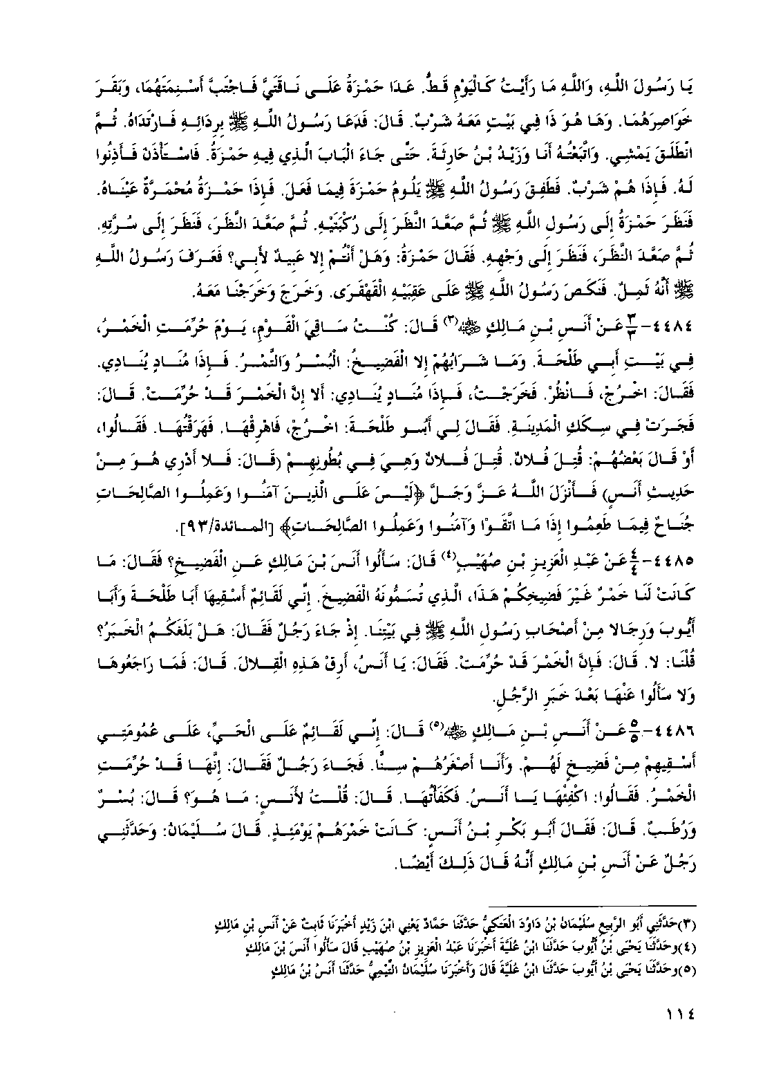 4485 - عن عبد العزيز بن صهيب قال: سألوا أنس بن مالك عن الفضيخ؟ فقال: ما كانت لنا خمر غير فضيخكم هذا، الذي تسمونه الفضيخ. إني لقائم أسقيها أبا طلحة وأبا أيوب ورجالاً من أصحاب رسول الله صلى الله عليه وسلم في بيتنا. إذ جاء رجل فقال: هل بلغكم الخبر؟ قلنا: لا. قال: فإن الخمر قد حرمت. فقال: يا أنس، أرق هذه القلال. قال: فما راجعوها ولا سألوا عنها بعد خبر الرجل.