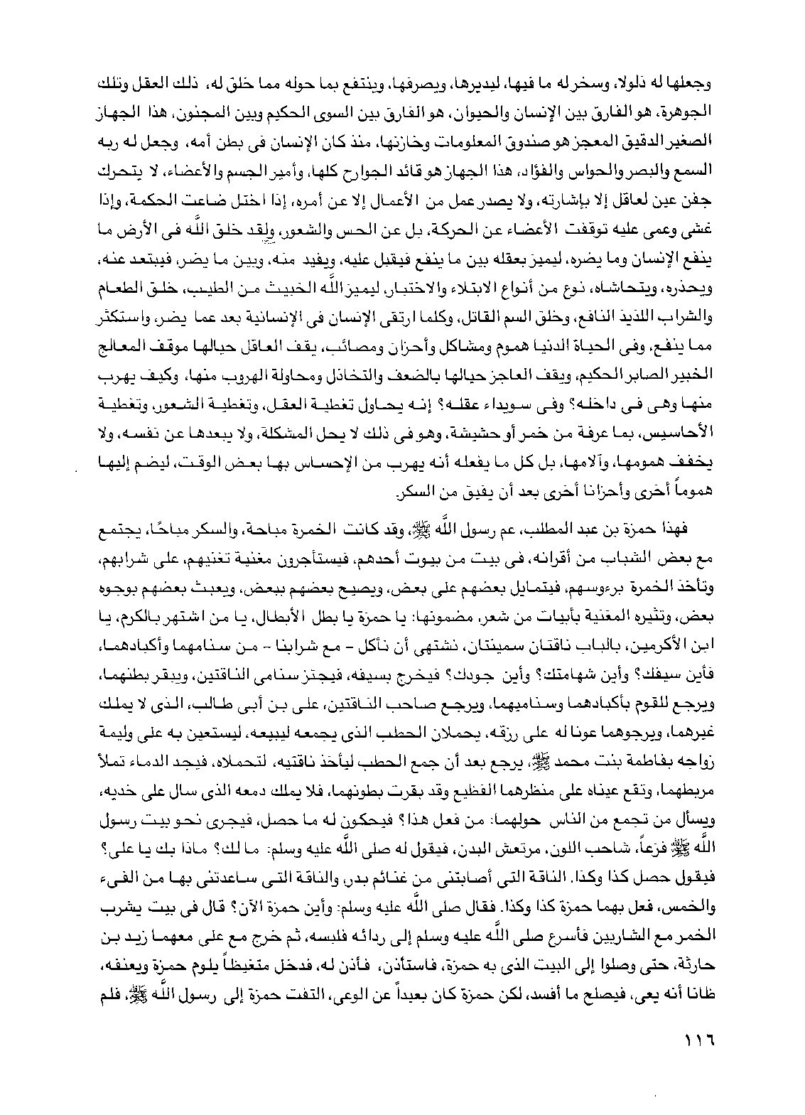 فهذا حمزة بن عبد المطلب، عم رسول الله صلى الله عليه وسلم، وقد كانت الخمرة مباحة، والسكر مباحاً، يجتمع مع بعض الشباب من أقرانه، في بيت من بيوت أحدهم، فيستأجرون مغنية تغنيهم، على شرابهم، وتأخذ الخمرة برءوسهم، فيتمايل بعضهم على بعض، ويصيح بعضهم ببعض، ويعبث بعضهم بوجوه بعض، وتثيره المغنية بأبيات من شعر، مضمونها: يا حمزة يا بطل الأبطال، يا من اشتهر بالكرم، يا ابن الأكرمين، بالباب ناقتان سمينتان، نشتهي أن نأكل -مع شرابنا- من سنامهما وأكبادهما، فأين سيفك؟ وأين شهامتك؟ وأين جودك؟ فيخرج بسيفه، فيجتز سنامي الناقتين، ويبقر بطنهما، ويرجع للقوم بأكبادهما وسناميهما، ويرجع صاحب الناقتين، علي بن أبي طالب، الذي لا يملك غيرهما، ويرجوهما عوناً له على رزقه، يحملان الحطب الذي يجمعه ليبيعه، ليستعين به على وليمة زواجه بفاطمة بنت محمد صلى الله عليه وسلم، يرجع بعد أن جمع الحطب ليأخذ ناقتيه، لتحملاه، فيجد الدماء تملأ مربطهما، وتقع عيناه على منظرهما الفظيع وقد بقرت بطونهما، فلا يملك دمعه الذي سال على خديه، ويسأل من تجمع من الناس حولهما: من فعل هذا؟ فيحكون له ما حصل، فيجري نحو بيت رسول الله صلى الله عليه وسلم فزعاً، شاحب اللون، مرتعش البدن، فيقول له صلى الله عليه وسلم: ما لك؟ ماذا بك يا علي؟ فيقول حصل كذا وكذا. الناقة التي أصابتني من غنائم بدر، والناقة التي ساعدتني بها من الفيء والخمس، فعل بهما حمزة كذا وكذا.