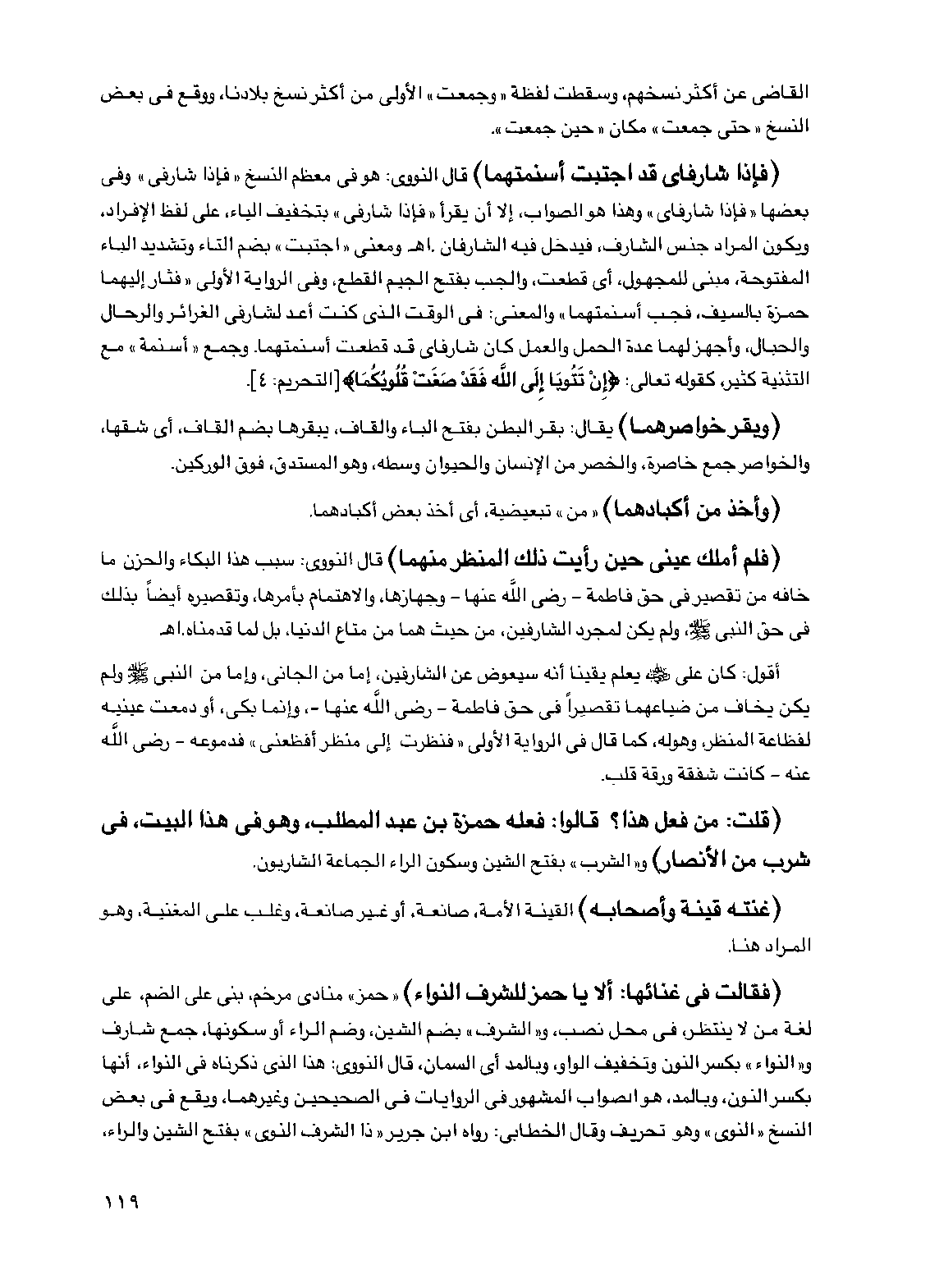(فقالت في غنائها: ألا يا حمز للشرف النواء) "حمز" منادي مرخم، بني على الضم، على لغة من لا ينتظر، في محل نصب، و"الشرف" بضم الشين، وضم الراء أو سكونها، جمع شارف و"النواء" بكسر النون وتخفيف الواو، وبالمد أي السمان، قال النووي: هذا الذي ذكرناه في النواء، أنها بكسر النون، وبالمد، هو الصواب المشهور في الروايات في الصحيحين وغيرهما، ويقع في بعض النسخ "النوي" وهو تحريف وقال الخطابي: رواه ابن جرير "ذا الشرف النوي" بفتح الشين والراء،
