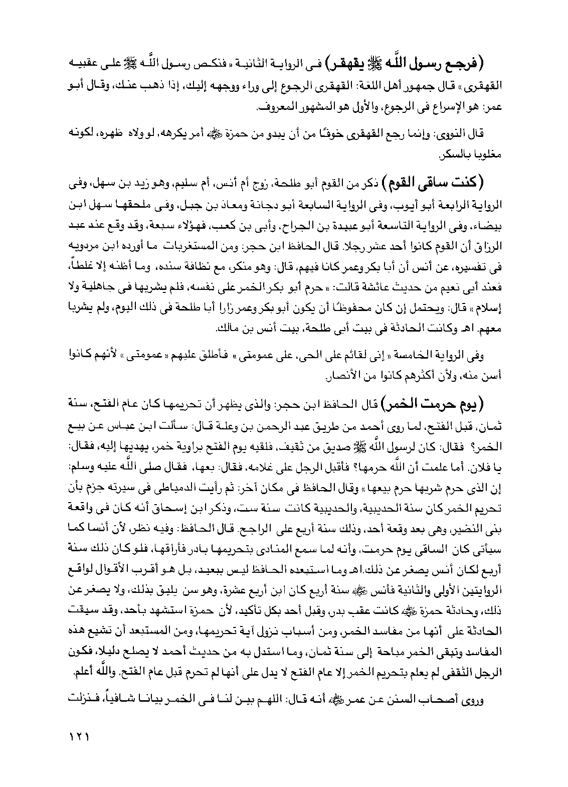 (يوم حرمت الخمر) قال الحافظ ابن حجر: والذي يظهر أن تحريمها كان عام الفتح، سنة ثمان، قبل الفتح، لما روى أحمد من طريق عبد الرحمن بن وعلة قال: سألت ابن عباس عن بيع الخمر؟ فقال: كان لرسول الله صلى الله عليه وسلم صديق من ثقيف، فلقيه يوم الفتح براوية خمر، يهديها إليه، فقال: يا فلان. أما علمت أن الله حرمها؟ فأقبل الرجل على غلامه، فقال: بعها، فقال صلى الله عليه وسلم: إن الذي حرم شربها حرم بيعها" وقال الحافظ في مكان آخر: ثم رأيت الدمياطي في سيرته جزم بأن تحريم الخمر كان سنة الحديبية، والحديبية كانت سنة ست، وذكر ابن إسحاق أنه كان في واقعة بني النضير، وهي بعد وقعة أحد، وذلك سنة أربع على الراجح. قال الحافظ: وفيه نظر، لأن أنساً كما سيأتي كان الساقي يوم حرمت، وأنه لما سمع المنادي بتحريمها بادر فأراقها، فلو كان ذلك سنة أربع لكان أنس يصغر عن ذلك. اهـ وما استبعده الحافظ ليس ببعيد، بل هو أقرب الأقوال لواقع الروايتين الأولى والثانية فأنس رضي الله عنه سنة أربع كان ابن أربع عشرة، وهو سن يليق بذلك، ولا يصغر عن ذلك، وحادثة حمزة رضي الله عنه كانت عقب بدر، وقبل أحد بكل تأكيد، لأن حمزة استشهد بأحد، وقد سيقت الحادثة على أنها من مفاسد الخمر، ومن أسباب نزول آية تحريمها، ومن المستبعد أن تشيع هذه المفاسد وتبقى الخمر مباحة إلى سنة ثمان، وما استدل به من حديث أحمد لا يصلح دليلاً، فكون الرجل الثقفي لم يعلم بتحريم الخمر إلا عام الفتح لا يدل على أنها لم تحرم قبل عام الفتح. والله أعلم.