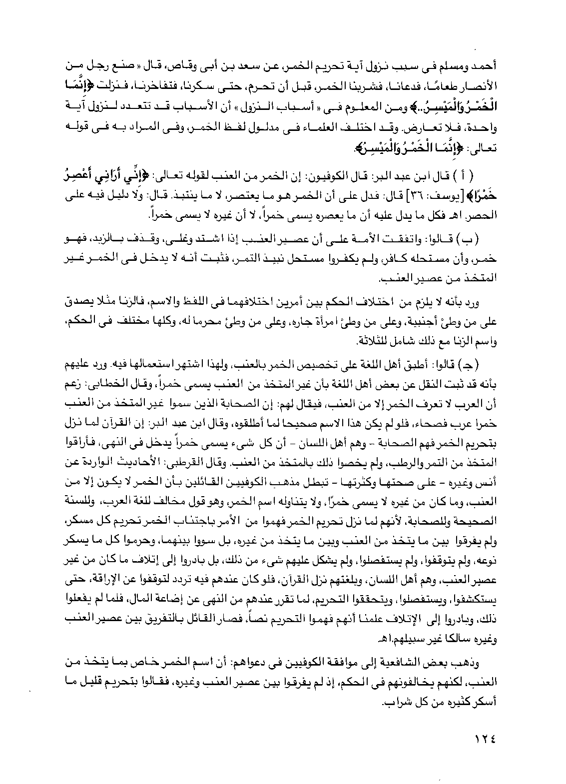 (أ) قال ابن عبد البر: قال الكوفيون: إن الخمر من العنب لقوله تعالى: {إني أراني أعصر خمراً} [يوسف: 36] قال: فدل على أن الخمر هو ما يعتصر، لا ما ينتبذ. قال: ولا دليل فيه على الحصر. اهـ فكل ما يدل عليه أن ما يعصره يسمى خمراً، لا أن غيره لا يسمى خمراً.