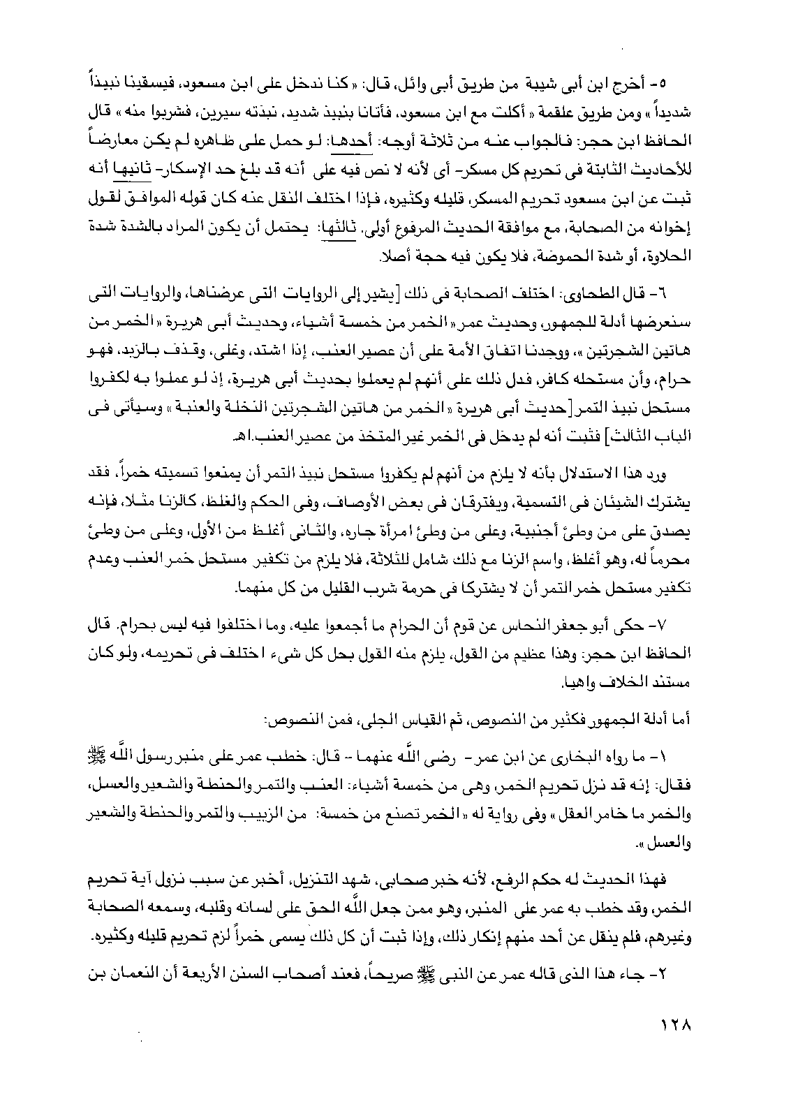 6 - قال الطحاوي: اختلف الصحابة في ذلك [يشير إلى الروايات التي عرضناها، والروايات التي سنعرضها أدلة للجمهور، وحديث عمر "الخمر من خمسة أشياء، وحديث أبي هريرة "الخمر من هاتين الشجرتين"، ووجدنا اتفاق الأمة على أن عصير العنب، إذا اشتد، وغلي، وقذف بالزبد، فهو حرام، وأن مستحله كافر، فدل ذلك على أنهم لم يعملوا بحديث أبي هريرة، إذ لو عملوا به لكفروا مستحل نبيذ التمر [حديث أبي هريرة "الخمر من هاتين الشجرتين النخلة والعنبة" وسيأتي في الباب الثالث] فثبت أنه لم يدخل في الخمر غير المتخذ من عصير العنب. اهـ