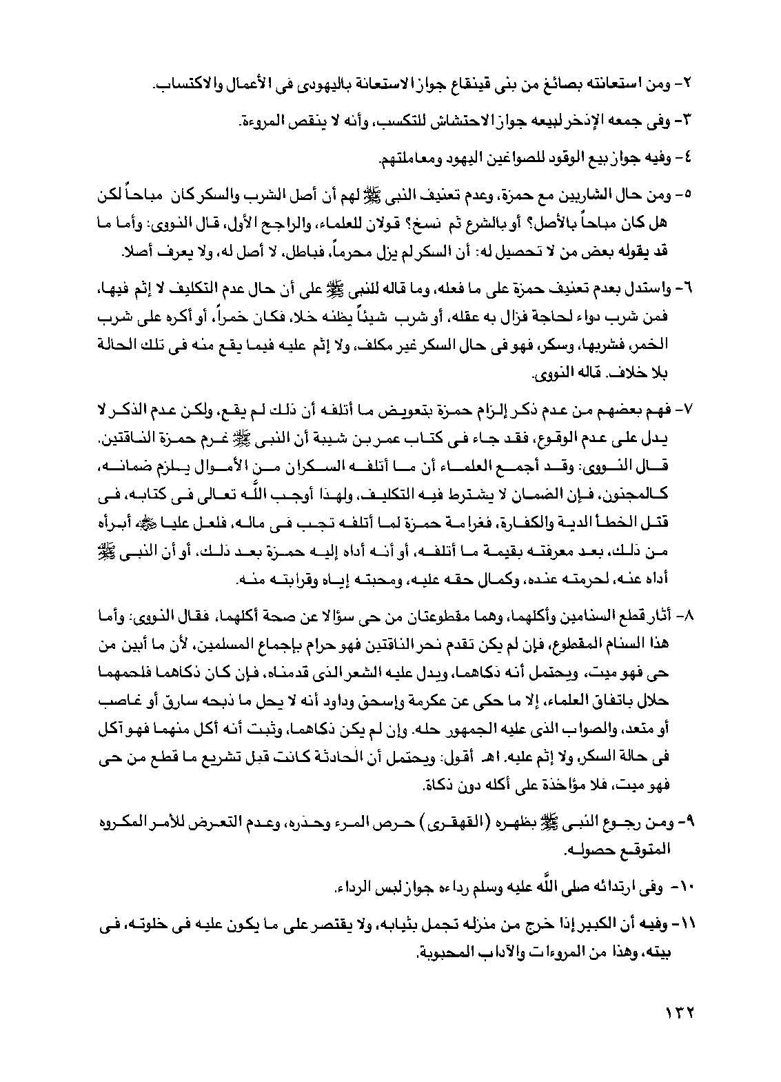 8 - أثار قطع السنامين وأكلهما، وهما مقطوعتان من حي سؤالاً عن صحة أكلهما، فقال النووي: وأما هذا السنام المقطوع، فإن لم يكن تقدم نحر الناقتين فهو حرام بإجماع المسلمين، لأن ما أبين من حي فهو ميت، ويحتمل أنه ذكاهما، ويدل عليه الشعر الذي قدمناه، فإن كان ذكاهما فلحمهما حلال باتفاق العلماء، إلا ما حكي عن عكرمة وإسحق وداود أنه لا يحل ما ذبحه سارق أو غاصب أو متعد، والصواب الذي عليه الجمهور حله. وإن لم يكن ذكاهما، وثبت أنه أكل منهما فهو آكل في حالة السكر، ولا إثم عليه. اهـ أقول: ويحتمل أن الحادثة كانت قبل تشريع ما قطع من حي فهو ميت، فلا مؤاخذة على أكله دون ذكاة.