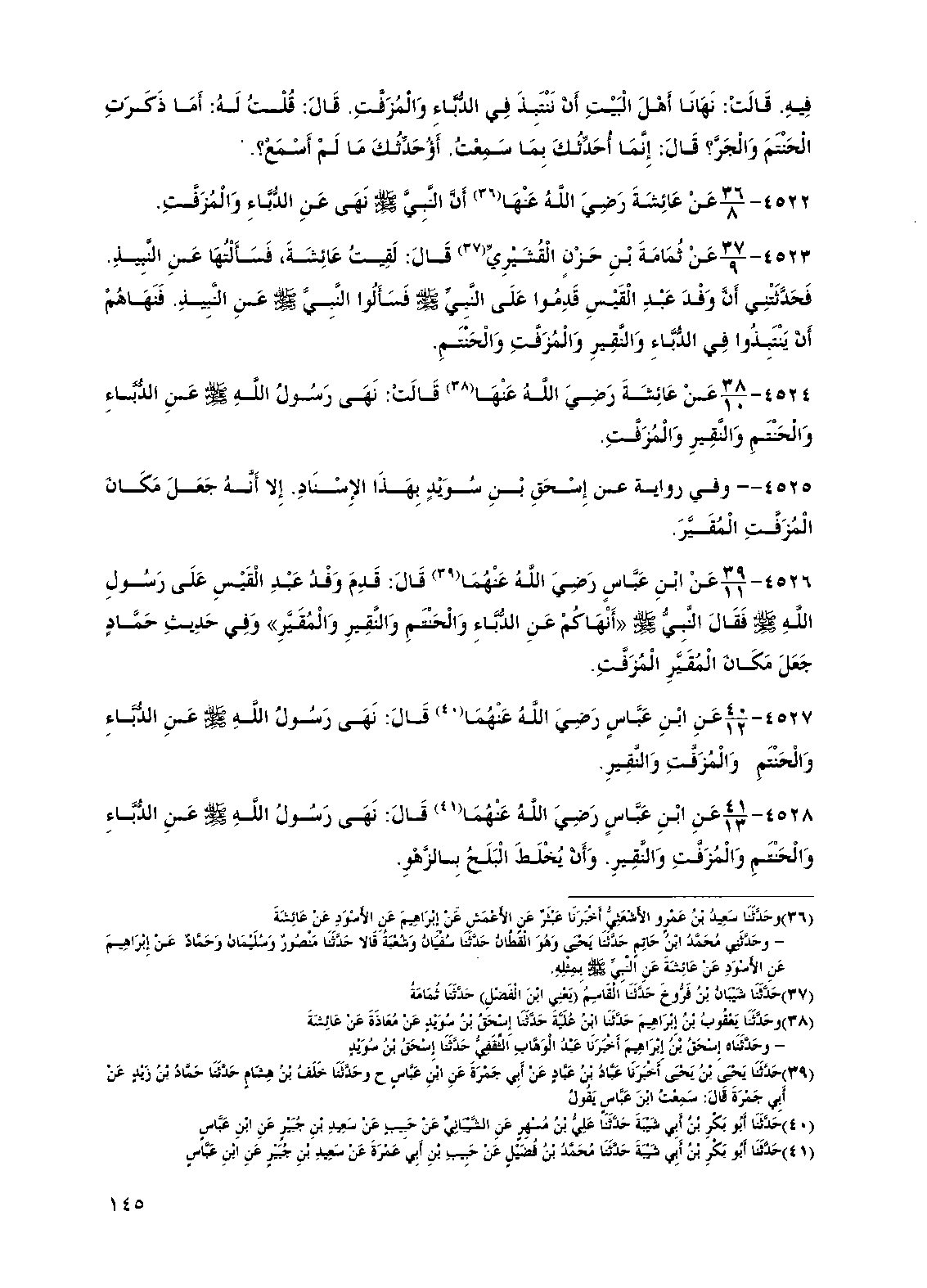 4523 - عن ثمامة بن حزن القشيري قال: لقيت عائشة، فسألتها عن النبيذ. فحدثتني أن وفد عبد القيس قدموا على النبي صلى الله عليه وسلم فسألوا النبي صلى الله عليه وسلم عن النبيذ. فنهاهم أن ينتبذوا في الدباء والنقير والمزفت والحنتم.