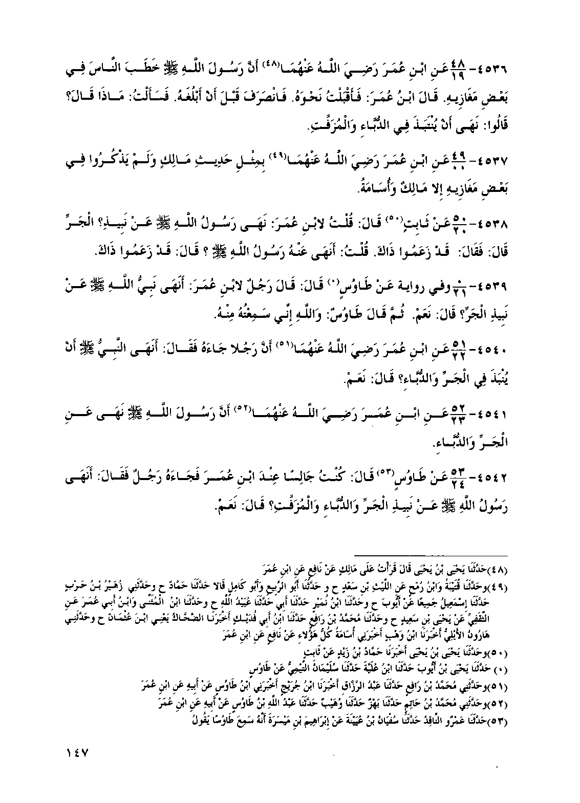 4542 - عن طاوس قال: كنت جالساً عند ابن عمر فجاءه رجل فقال: أنهى رسول الله صلى الله عليه وسلم عن نبيذ الجر والدباء والمزفت؟ قال: نعم.