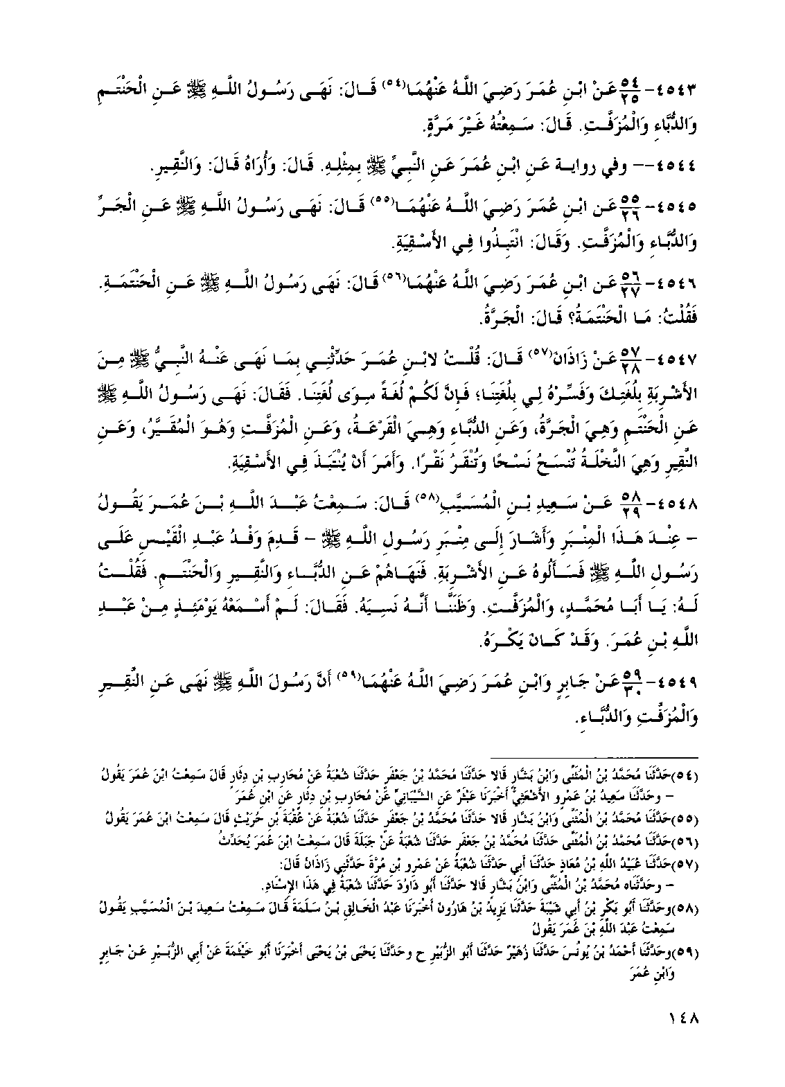4543 - عن ابن عمر رضي الله عنهما قال: نهى رسول الله صلى الله عليه وسلم عن الحنتم والدباء والمزفت. قال: سمعته غير مرة.