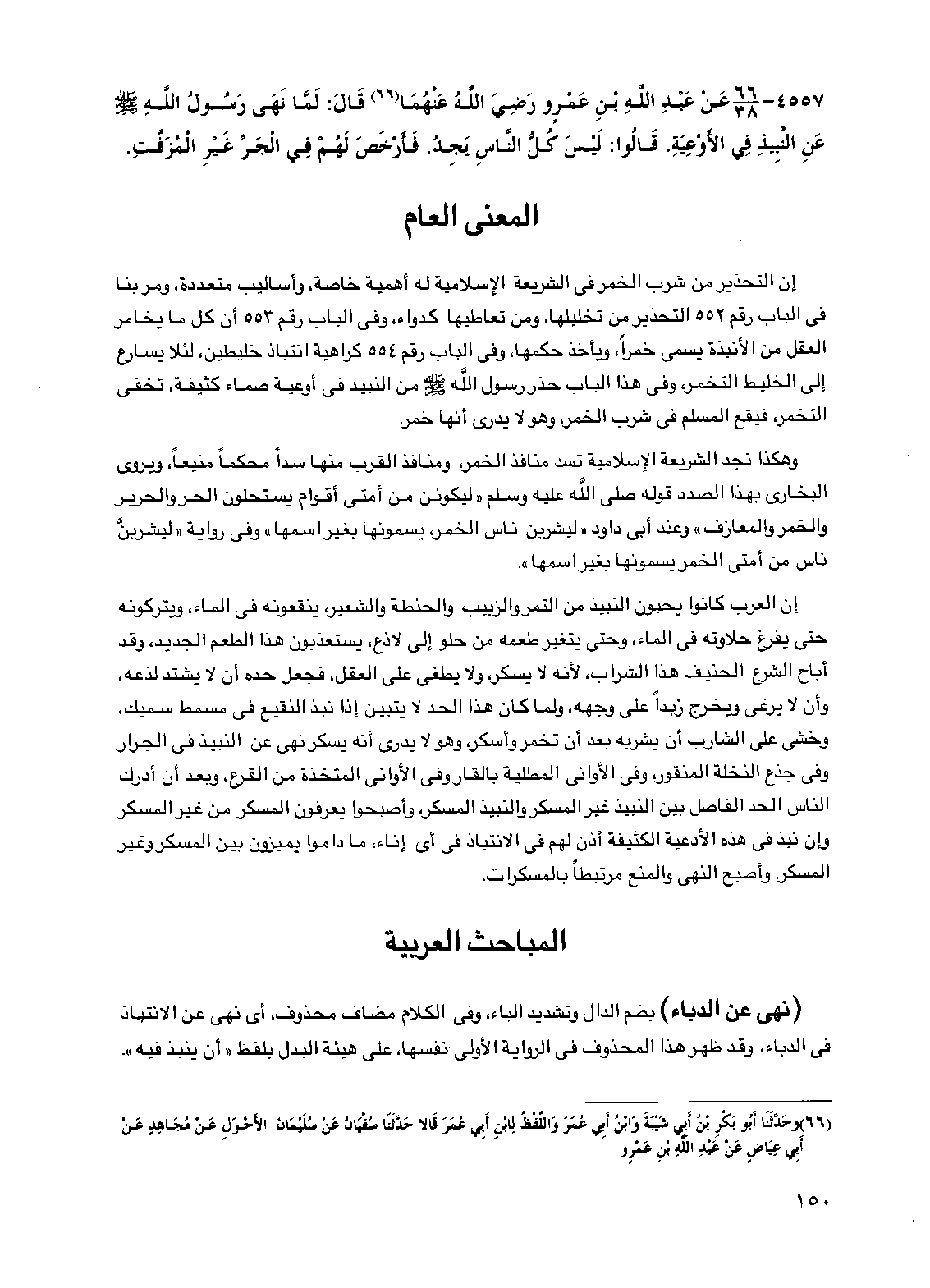 إن العرب كانوا يحبون النبيذ من التمر والزبيب والحنطة والشعير، ينقعونه في الماء، ويتركونه حتى يفرغ حلاوته في الماء، وحتى يتغير طعمه من حلو إلى لاذع، يستعذبون هذا الطعم الجديد، وقد أباح الشرع الحنيف هذا الشراب، لأنه لا يسكر، ولا يطغى على العقل، فجعل حده أن لا يشتد لذعه، وأن لا يرغي ويخرج زبداً على وجهه، ولما كان هذا الحد لا يتبين إذا نبذ النقيع في مسمط سميك، وخشي على الشارب أن يشربه بعد أن تخمر وأسكر، وهو لا يدري أنه يسكر نهي عن النبيذ في الجرار وفي جذع النخلة المنقور، وفي الأواني المطلية وفي الأواني المتخذة من القرع، وبعد أن أدرك الناس الحد الفاصل بين النبيذ غير المسكر والنبيذ المسكر، وأصبحوا يعرفون المسكر من غير المسكر وإن نبذ في هذه الأدعية الكثيفة أذن لهم في الانتباذ في أي إناء، ماداموا يميزون بين المسكر وغير المسكر. وأصبح النهي والمنع مرتبطاً بالمسكرات.