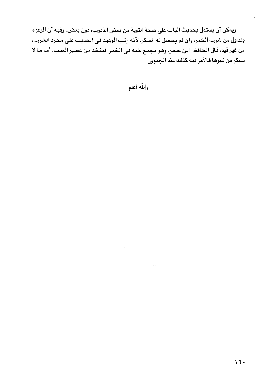 ويمكن أن يستدل بحديث الباب على صحة التوبة من بعض الذنوب، دون بعض، وفيه أن الوعيد يتناول من شرب الخمر، وإن لم يحصل له السكر، لأنه رتب الوعيد في الحديث على مجرد الشرب، من غير قيد، قال الحافظ ابن حجر: وهو مجمع عليه في الخمر المتخذ من عصير العنب، أما ما لا يسكر من غيرها فالأمر فيه كذلك عند الجمهور.