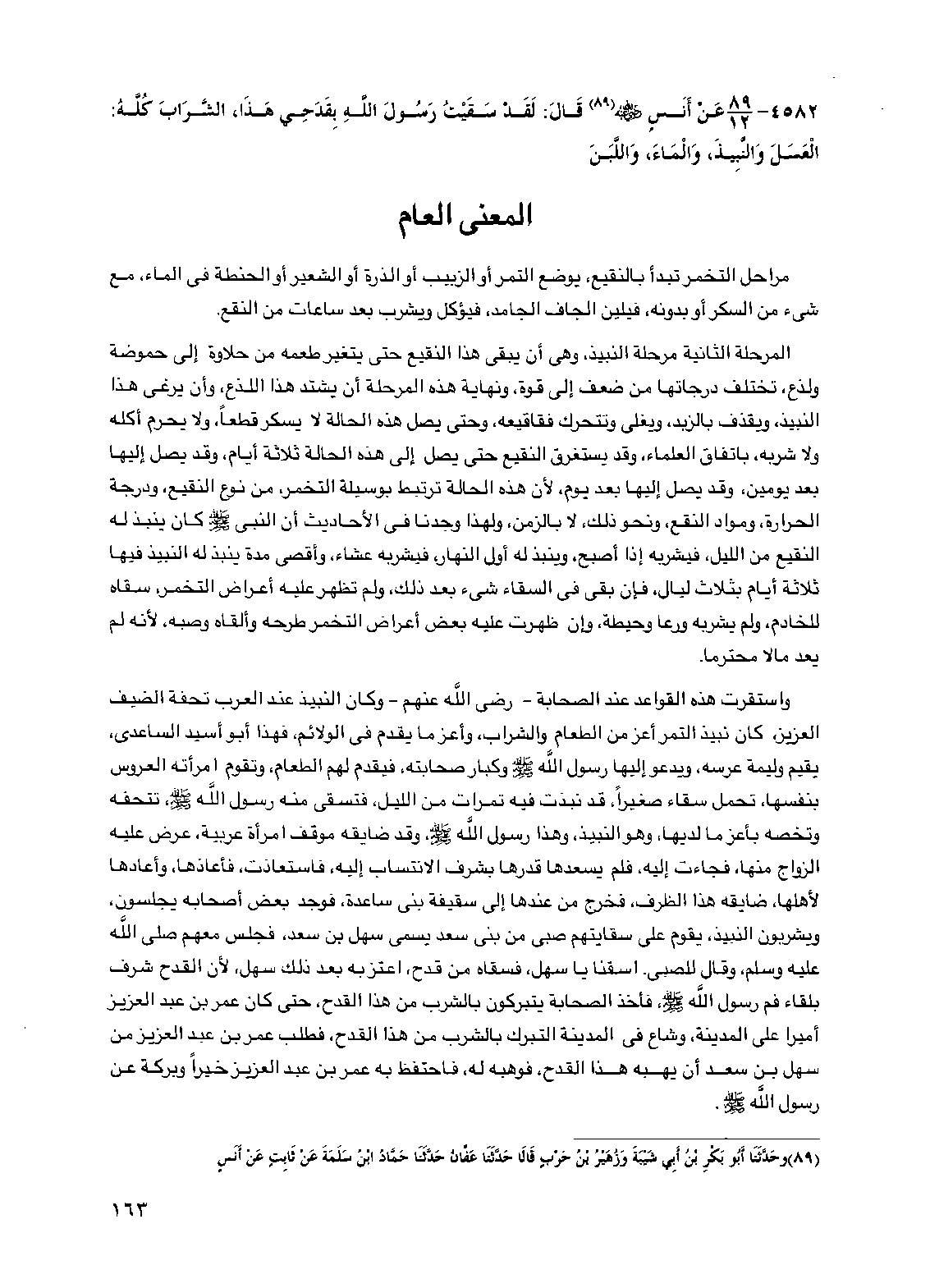 واستقرت هذه القواعد عند الصحابة -رضي الله عنهم- وكان النبيذ عند العرب تحفة الضيف العزيز، كان نبيذ التمر أعز من الطعام والشراب، وأعز ما يقدم في الولائم، فهذا أبو أسيد الساعدي، يقيم وليمة عرسه، ويدعو إليها رسول الله صلى الله عليه وسلم وكبار صحابته، فيقدم لهم الطعام، وتقوم امرأته العروس بنفسها، تحمل سقاء صغيراً، قد نبذت فيه تمرات من الليل، فتسقي منه رسول الله صلى الله عليه وسلم، تتحفه وتخصه بأعز ما لديها، وهو النبيذ، وهذا رسول الله صلى الله عليه وسلم، وقد ضايقه موقف امرأة عربية، عرض عليه الزواج منها، فجاءت إليه، فلم يسعدها قدرها بشرف الانتساب إليه، فاستعاذت، فأعاذها، وأعادها لأهلها، ضايقه هذا الظرف، فخرج من عندها إلى سقيفة بني ساعدة، فوجد بعض أصحابه يجلسون، ويشربون النبيذ، يقوم على سقايتهم صبي من بني سعد يسمى سهل بن سعد، فجلس معهم صلى الله عليه وسلم، وقال للصبي. اسقنا يا سهل، فسقاه من قدح، اعتز به بعد ذلك سهل، لأن القدح شرف بلقاء فم رسول الله صلى الله عليه وسلم، فأخذ الصحابة يتبركون بالشرب من هذا القدح، حتى كان عمر بن عبد العزيز أميراً على المدينة، وشاع في المدينة التبرك بالشرب من هذا القدح، فطلب عمر بن عبد العزيز من سهل بن سعد أن يهبه هذا القدح، فوهبه له، فاحتفظ به عمر بن عبد العزيز خيراً وبركة عن رسول الله صلى الله عليه وسلم.