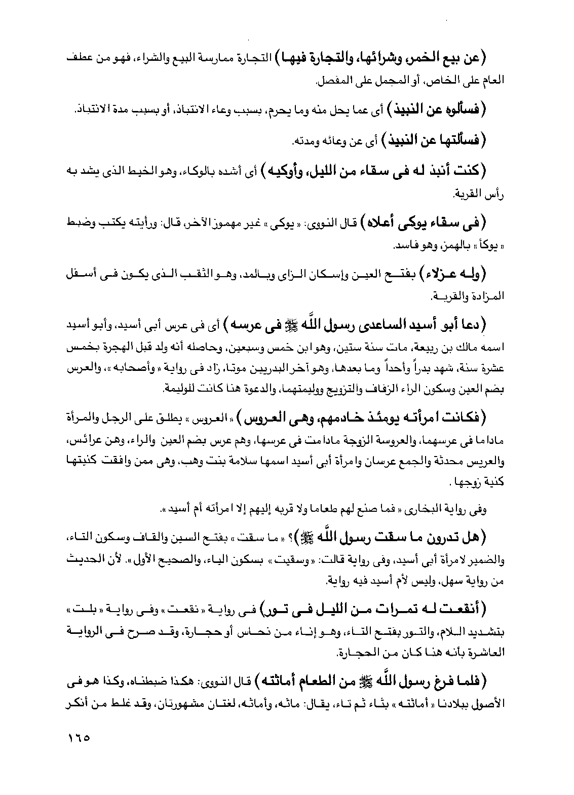 (فكانت امرأته يومئذ خادمهم، وهي العروس) "العروس" يطلق على الرجل والمرأة ماداما في عرسهما، والعروسة الزوجة مادامت في عرسها، وهم عرس بضم العين والراء، وهن عرائس، والعريس محدثة والجمع عرسان وامرأة أبي أسيد اسمها سلامة بنت وهب، وهي ممن وافقت كنيتها كنية زوجها.