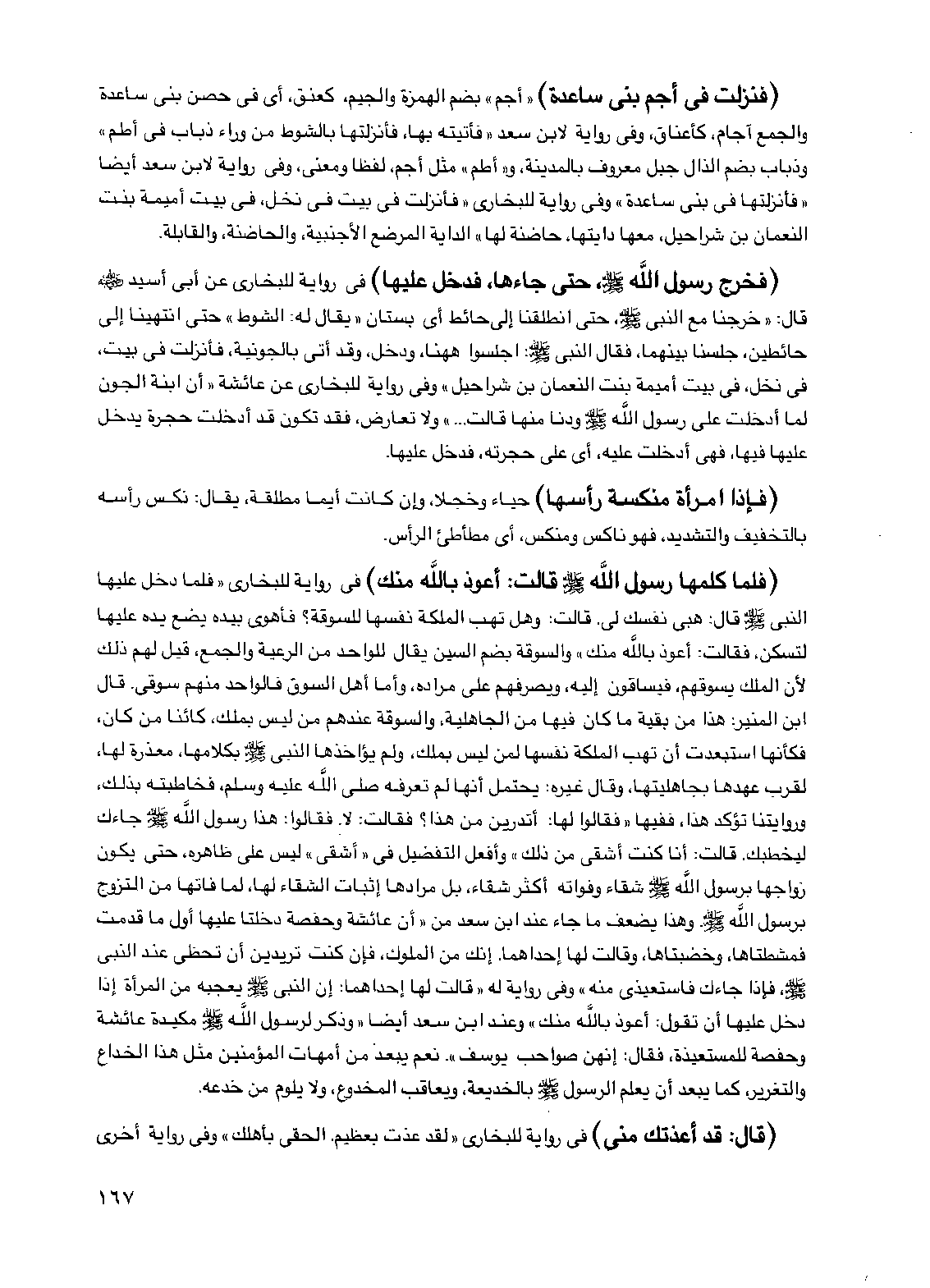 (فنزلت في أجم بني ساعدة) "أجم" بضم الهمزة والجيم، كعنق، أي في حصن بني ساعدة والجمع آجام، كأعناق، وفي رواية لابن سعد "فأتيته بها، فأنزلتها بالشوط من وراء ذباب في أطم" وذباب بضم الذال جبل معروف بالمدينة، و"أطم" مثل أجم، لفظاً ومعنى، وفي رواية لابن سعد أيضاً "فأنزلتها في بني ساعدة" وفي رواية للبخاري "فأنزلت في بيت في نخل، في بيت أميمة بنت النعمان بن شراحيل، معها دايتها، حاضنة لها" الداية المرضع الأجنبية، والحاضنة، والقابلة.