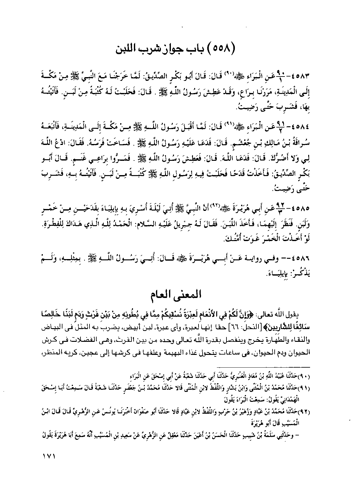 4583 - عن البراء رضي الله عنه قال: قال أبو بكر الصديق: لما خرجنا مع النبي صلى الله عليه وسلم من مكة إلى المدينة، مررنا براع، وقد عطش رسول الله صلى الله عليه وسلم. قال: فحلبت له كثبة من لبن. فأتيته بها، فشرب حتى رضيت.
