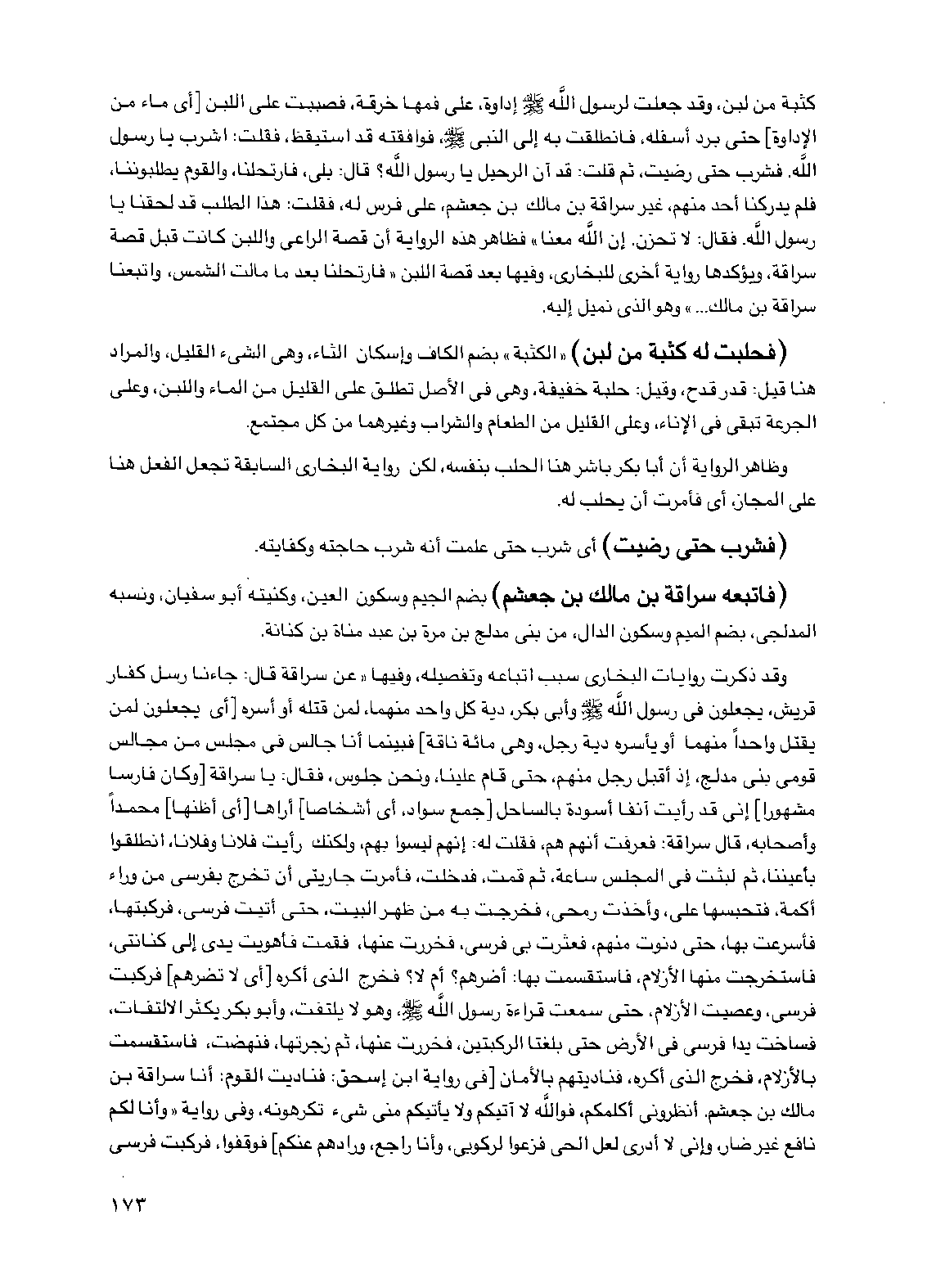 كثبة من لبن، وقد جعلت لرسول الله صلى الله عليه وسلم إداوة، على فمها خرقة، فصببت على اللبن [أي ماء من الإداوة] حتى برد أسفله، فانطلقت به إلى النبي صلى الله عليه وسلم، فوافقته قد استيقظ، فقلت: اشرب يا رسول الله. فشرب حتى رضيت، ثم قلت: قد آن الرحيل يا رسول الله؟ قال: بلى، فارتحلنا، والقوم يطلبوننا، فلم يدركنا أحد منهم، غير سراقة بن مالك بن جعشم، على فرس له، فقلت: هذا الطلب قد لحقنا يا رسول الله. فقال: لا تحزن. إن الله معنا" فظاهر هذه الرواية أن قصة الراعي واللبن كانت قبل قصة سراقة، ويؤكدها رواية أخرى للبخاري، وفيها بعد قصة اللبن "فارتحلنا بعد ما مالت الشمس، واتبعنا سراقة بن مالك ... " وهو الذي نميل إليه.