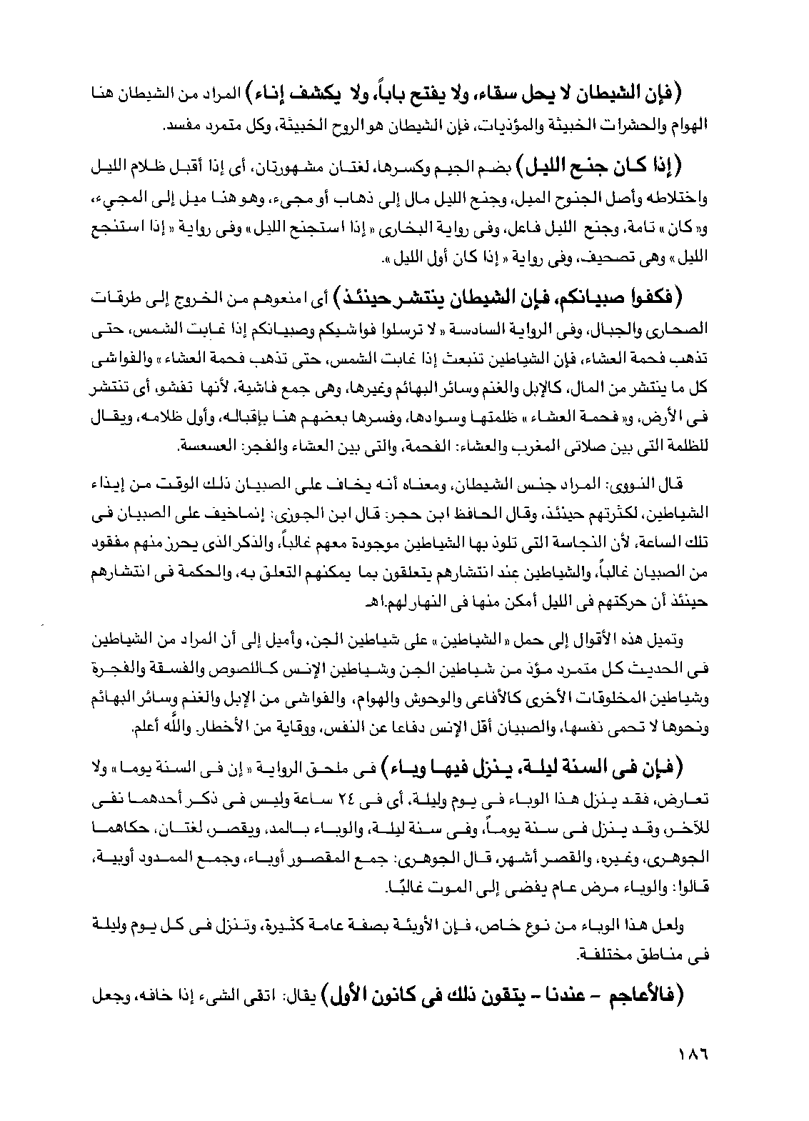(فإن الشيطان لا يحل سقاء، ولا يفتح باباً، ولا يكشف إناء) المراد من الشيطان هنا الهوام والحشرات الخبيثة والمؤذيات، فإن الشيطان هو الروح الخبيثة، وكل متمرد مفسد.