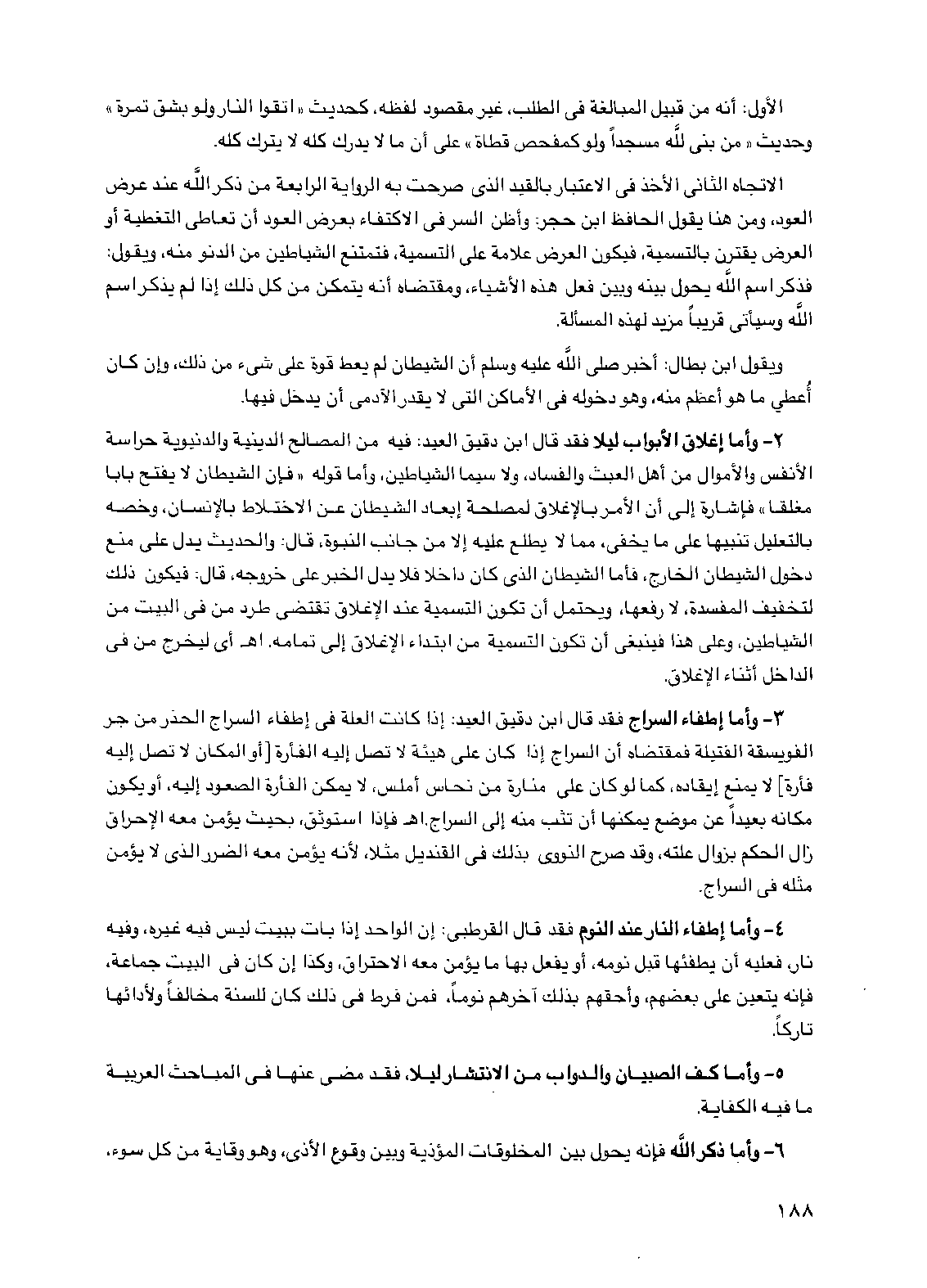 3 - وأما إطفاء السراج فقد قال ابن دقيق العيد: إذا كانت العلة في إطفاء السراج الحذر من جر الفويسقة الفتيلة فمقتضاه أن السراج إذا كان على هيئة لا تصل إليه الفأرة [أو المكان لا تصل إليه فأرة] لا يمنع إيقاده، كما لو كان على منارة من نحاس أملس، لا يمكن الفأرة الصعود إليه، أو يكون مكانه بعيداً عن موضع يمكنها أن تثب منه إلى السراج. اهـ فإذا استوثق، بحيث يؤمن معه الإحراق زال الحكم بزوال علته، وقد صرح النووي بذلك في القنديل مثلاً، لأنه يؤمن معه الضرر الذي لا يؤمن مثله في السراج.
