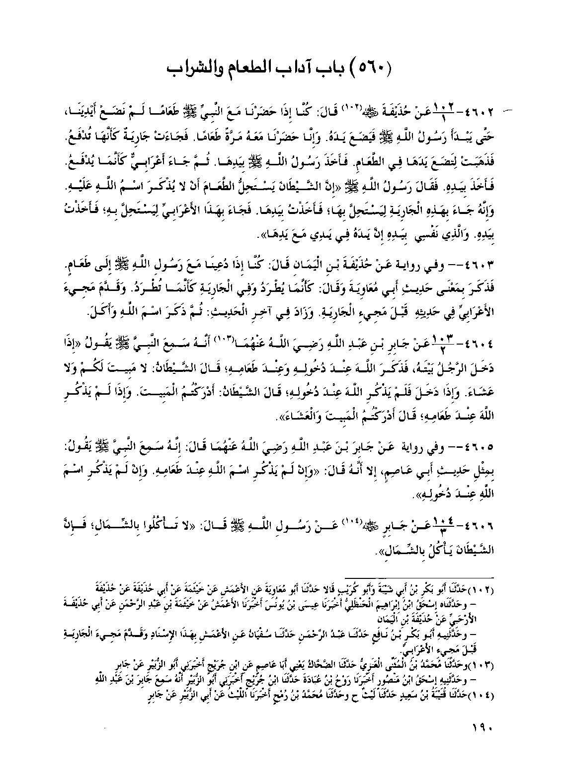 4602 - عن حذيفة رضي الله عنه قال: كنا إذا حضرنا مع النبي صلى الله عليه وسلم طعاماً لم نضع أيديناً، حتى يبدأ رسول الله صلى الله عليه وسلم فيضع يده. وإنا حضرنا معه مرة طعاماً. فجاءت جارية كأنها تدفع. فذهبت لتضع يدها في الطعام. فأخذ رسول الله صلى الله عليه وسلم بيدها. ثم جاء أعرابي كأنما يدفع. فأخذ بيده. فقال رسول الله صلى الله عليه وسلم "إن الشيطان يستحل الطعام أن لا يذكر اسم الله عليه. وإنه جاء بهذه الجارية ليستحل بها؛ فأخذت بيدها. فجاء بهذا الأعرابي ليستحل به؛ فأخذت بيده. والذي نفسي بيده إن يده في يدي مع يدها".
