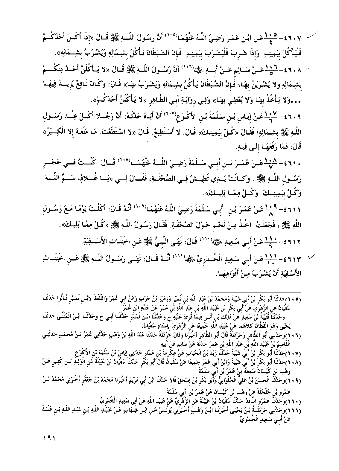 4608 - عن سالم عن أبيه رضي الله عنه أن رسول الله صلى الله عليه وسلم قال "لا يأكلن أحد منكم بشماله ولا يشربن بها؛ فإن الشيطان يأكل بشماله ويشرب بها" قال: وكان نافع يزيد فيها ولا يأخذ بها ولا يعطي بها" وفي رواية أبي الطاهر "لا يأكلن أحدكم".