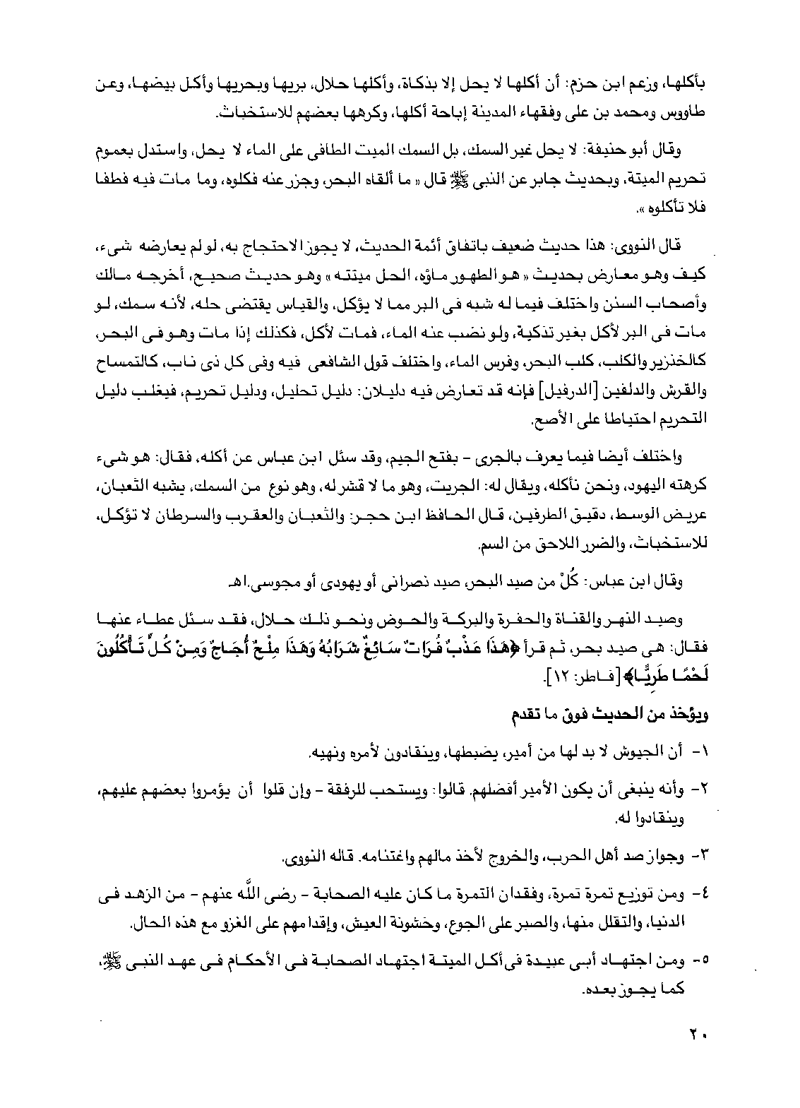 قال النووي: هذا حديث ضعيف باتفاق أئمة الحديث، لا يجوز الاحتجاج به، لو لم يعارضه شيء، كيف وهو معارض بحديث "هو الطهور ماؤه، الحل ميتته" وهو حديث صحيح، أخرجه مالك وأصحاب السنن واختلف فيما له شبه في البر مما لا يؤكل، والقياس يقتضي حله، لأنه سمك، لو مات في البر لأكل بغير تذكية، ولو نصب عنه الماء، فمات لأكل، فكذلك إذا مات وهو في البحر، كالخنزير والكلب، كلب البحر، وفرس الماء، واختلف قول الشافعي فيه وفي كل ذي ناب، كالتمساح والقرش والدلفين [الدرفيل] فإنه قد تعارض فيه دليلان: دليل تحليل، ودليل تحريم، فيغلب دليل التحريم احتياطاً على الأصح.