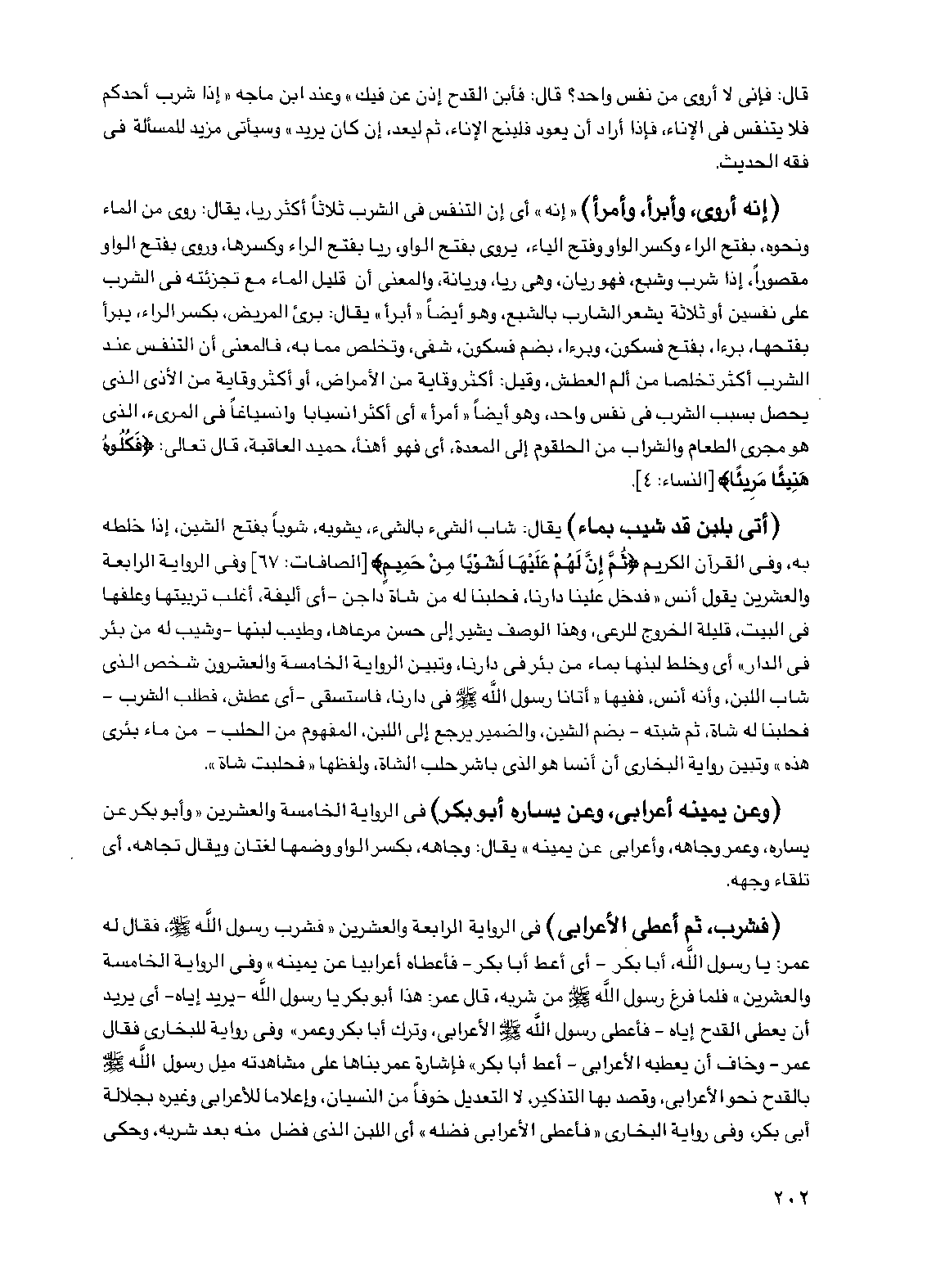 (إنه أروى، وأبرأ، وأمرأ) "إنه" أي إن التنفس في الشرب ثلاثاً أكثر رياً، يقال: روى من الماء ونحوه، بفتح الراء وكسر الواو وفتح الياء، يروى بفتح الواو، رياً بفتح الراء وكسرها، وروي بفتح الواو مقصوراً، إذا شرب وشبع، فهو ريان، وهي رياً، وريانة، والمعنى أن قليل الماء مع تجزئته في الشرب على نفسين أو ثلاثة يشعر الشارب بالشبع، وهو أيضاً "أبرأ" يقال: برئ المريض، بكسر الراء، يبرأ بفتحها، برءاً، بفتح فسكون، وبرءاً، بضم فسكون، شفي، وتخلص مما به، فالمعنى أن التنفس عند الشرب أكثر تخلصاً من ألم العطش، وقيل: أكثر وقاية من الأمراض، أو أكثر وقاية من الأذى الذي يحصل بسبب الشرب في نفس واحد، وهو أيضاً "أمرأ" أي أكثر انسياباً وانسياغاً في المريء، الذي هو مجرى الطعام والشراب من الحلقوم إلى المعدة، أي فهو أهنأ، حميد العاقبة، قال تعالى: {فكلوه هنيئاً مريئاً} [النساء: 4].