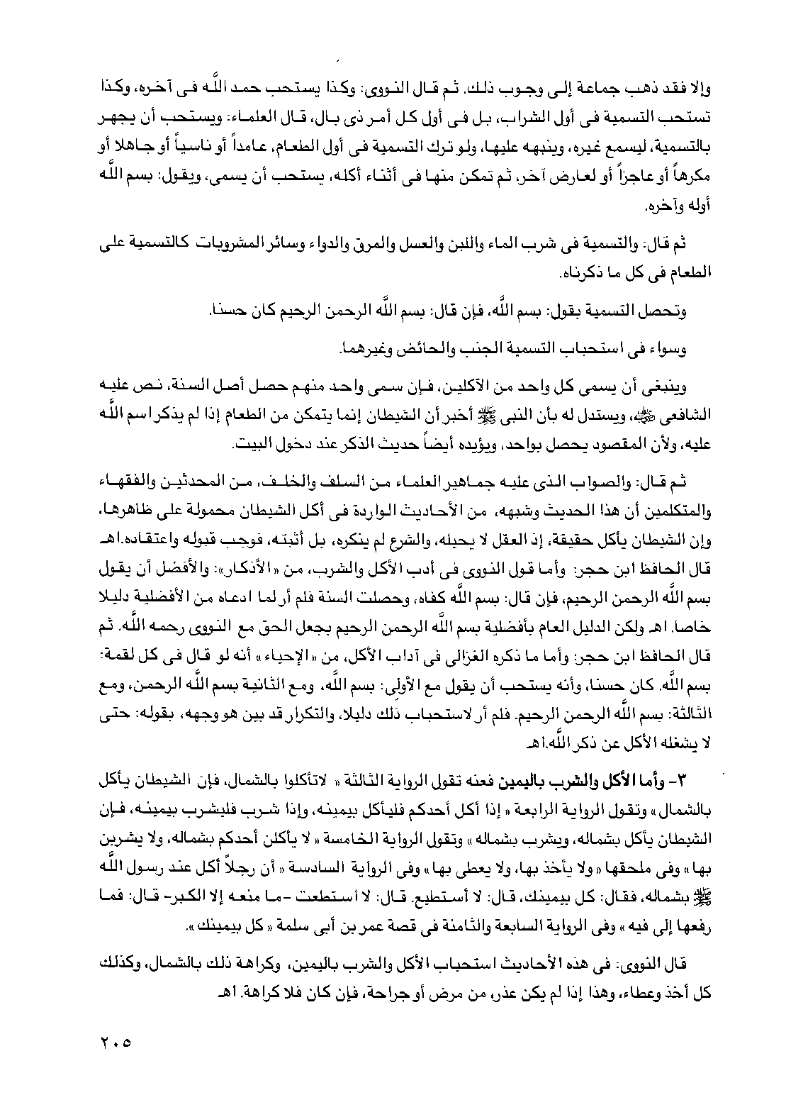 قال الحافظ ابن حجر: وأما قول النووي في أدب الأكل والشرب، من "الأذكار": والأفضل أن يقول بسم الله الرحمن الرحيم، فإن قال: بسم الله كفاه، وحصلت السنة فلم أر لما ادعاه من الأفضلية دليلاً خاصاً. اهـ ولكن الدليل العام بأفضلية بسم الله الرحمن الرحيم بجعل الحق مع النووي رحمه الله. ثم قال الحافظ ابن حجر: وأما ما ذكره الغزالي في آداب الأكل، من "الإحياء" أنه لو قال في كل لقمة: بسم الله. كان حسناً، وأنه يستحب أن يقول مع الأولى: بسم الله، ومع الثانية بسم الله الرحمن، ومع الثالثة، بسم الله الرحمن الرحيم. فلم أر لاستحباب ذلك دليلاً، والتكرار قد بين هو وجهه، بقوله: حتى لا يشغله الأكل عن ذكر الله. اهـ