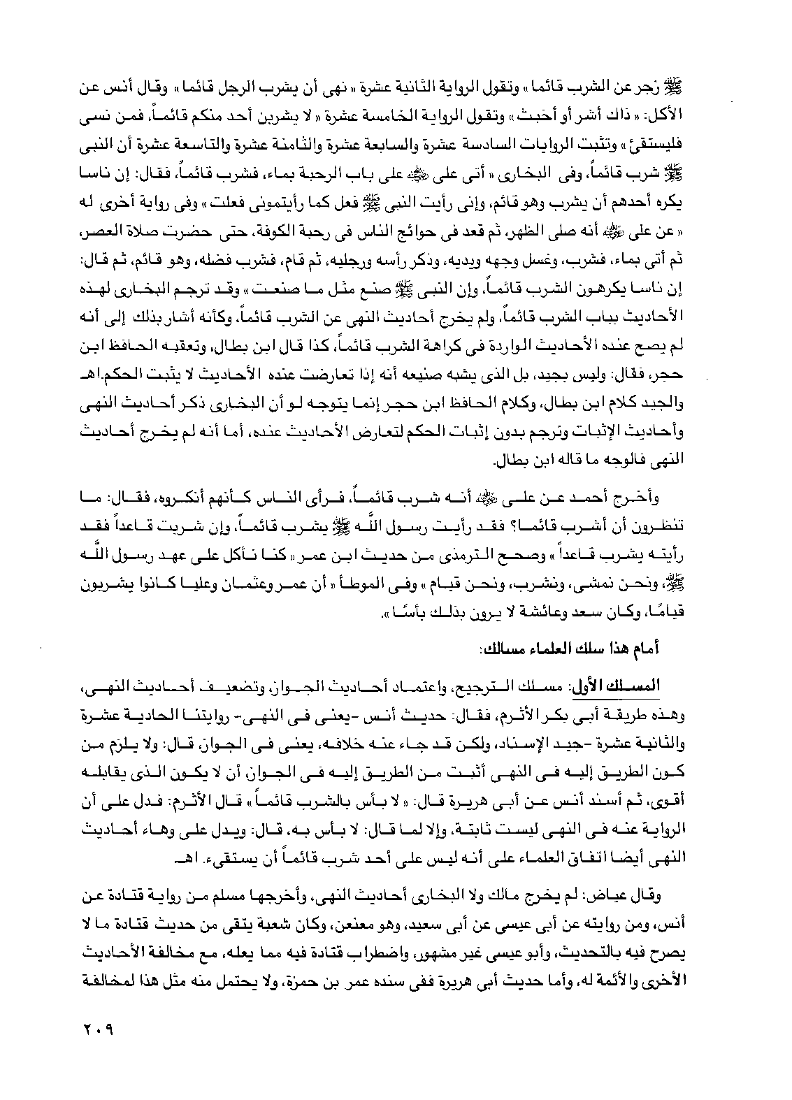المسلك الأول: مسلك الترجيح، واعتماد أحاديث الجواز، وتضعيف أحاديث النهي، وهذه طريقة أبي بكر الأثرم، فقال: حديث أنس -يعني في النهي- روايتنا الحادية عشرة والثانية عشرة- جيد الإسناد، ولكن قد جاء عنه خلافه، يعني في الجواز، قال: ولا يلزم من كون الطريق إليه في النهي أثبت من الطريق إليه في الجواز، أن لا يكون الذي يقابله أقوى، ثم أسند أنس عن أبي هريرة قال: "لا بأس بالشرب قائماً" قال الأثرم: فدل على أن الرواية عنه في النهي ليست ثابتة، وإلا لما قال: لا بأس به، قال: ويدل على وهاء أحاديث النهي أيضاً اتفاق العلماء على أنه ليس على أحد شرب قائماً أن يستقئ. اهـ